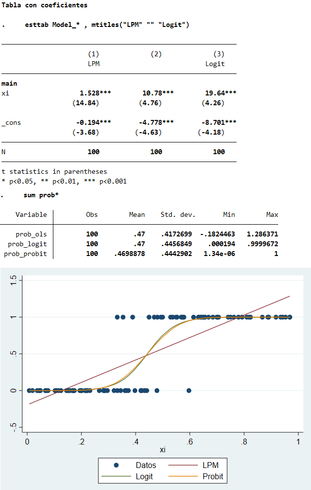 probit para Probit y logit para Logit. Aunque, de forma mas general, recordemos que se puede usan MLE al crear un programa en Stata y usar el comando ml.glm de la libreria ‘stats’. Aunque, de forma mas general, recordemos que se puede usan MLE al crear una función en R y usar la librearia o paquete maxLik.probit y logit)