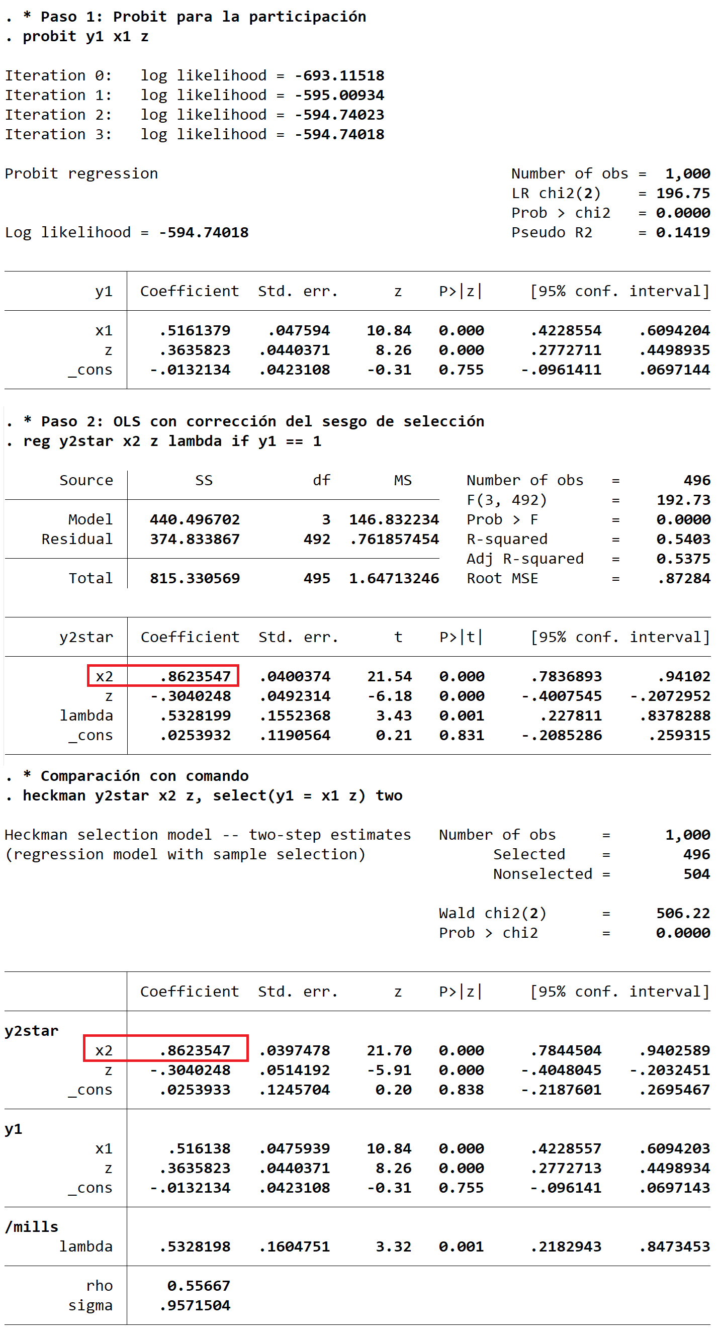 Se estima la ecuación de resultado (\(y_i^{2*}\)) mediante una regresión OLS que incluye la relación de Mills inversa (\(\hat{\lambda}_i\)) como una variable explicativa adicional: