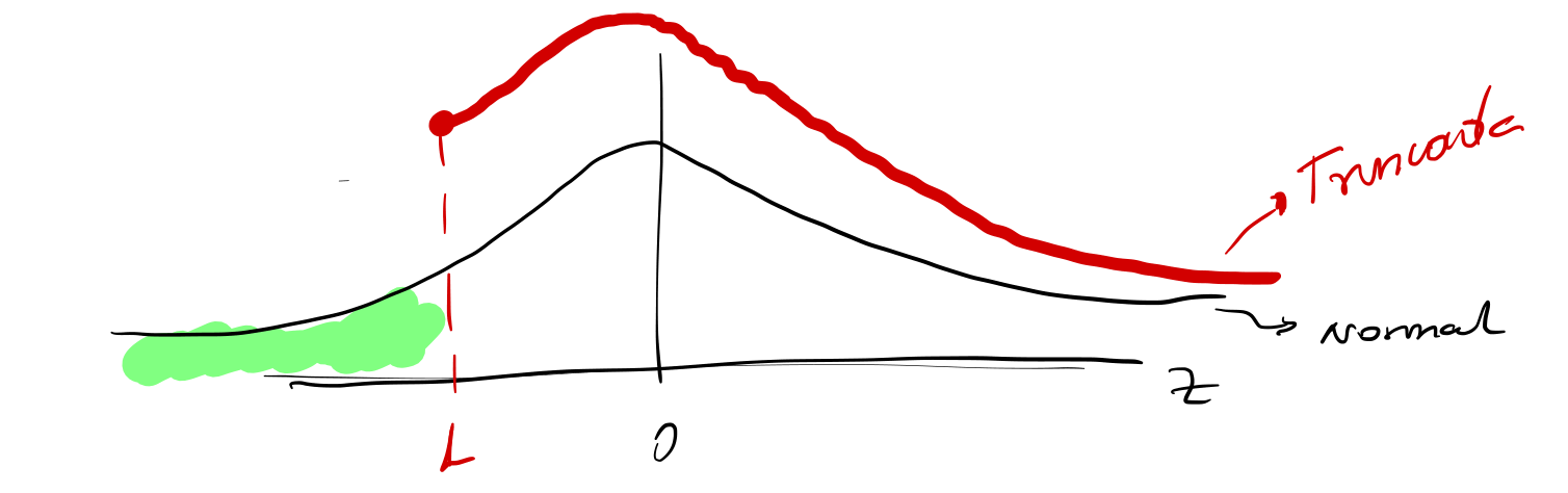 Distribución de \(y_i^*\) (condicional al truncamiento): La función de densidad de \(y_i^*\) , condicional a que \(y_i^* > L\) (truncamiento por debajo), es: