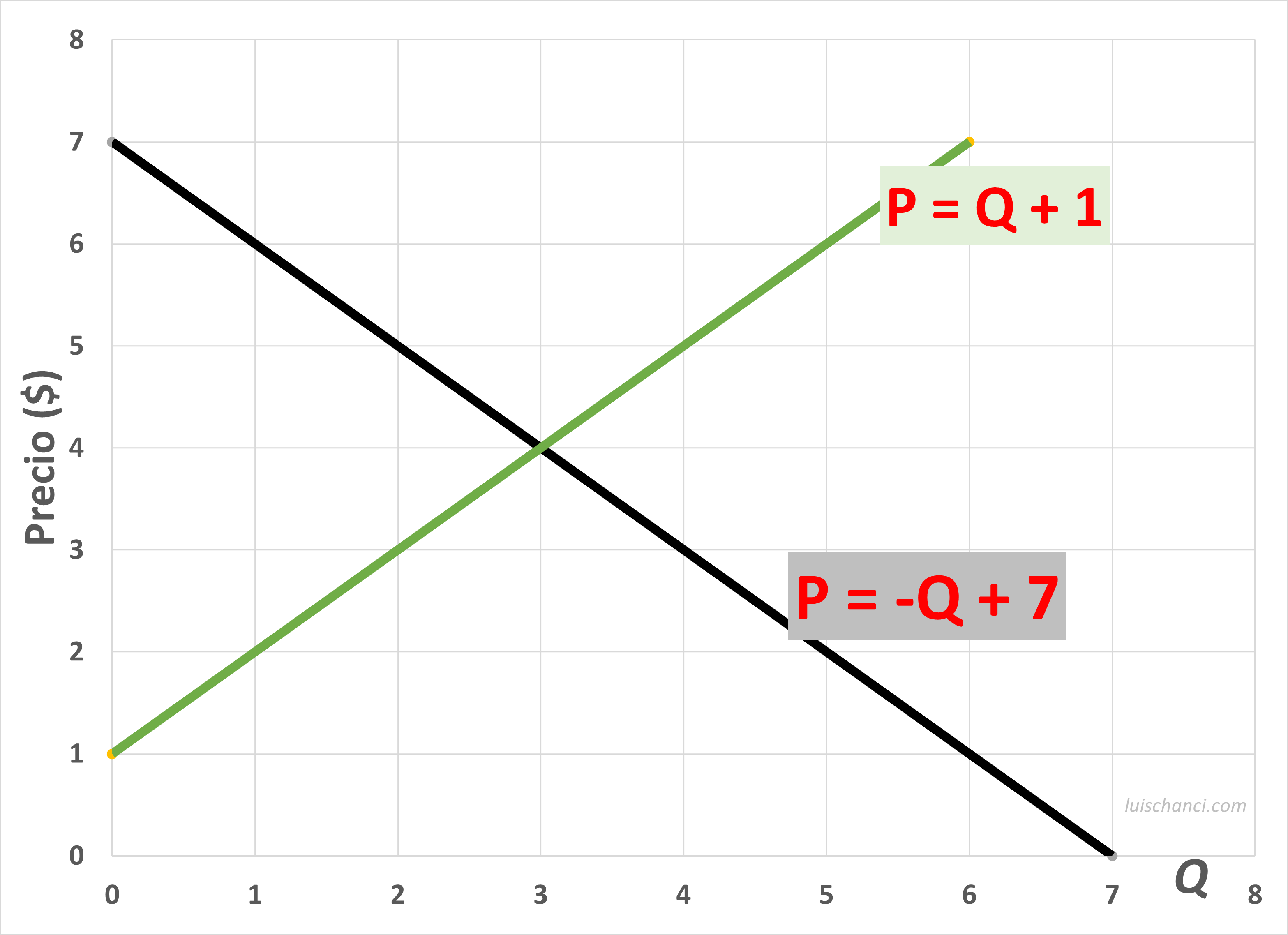 Por ende, el equilibrio es: \(P=3\) y \(Q=4\) .