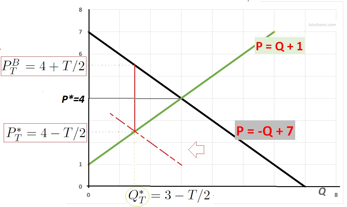 Así, el precio que los compradores pagan es \(P^B_T=7-Q^*_T=7-(3-T/2)=4+T/2\) y los vendedores reciben \(P^s_T=P^*_T\).