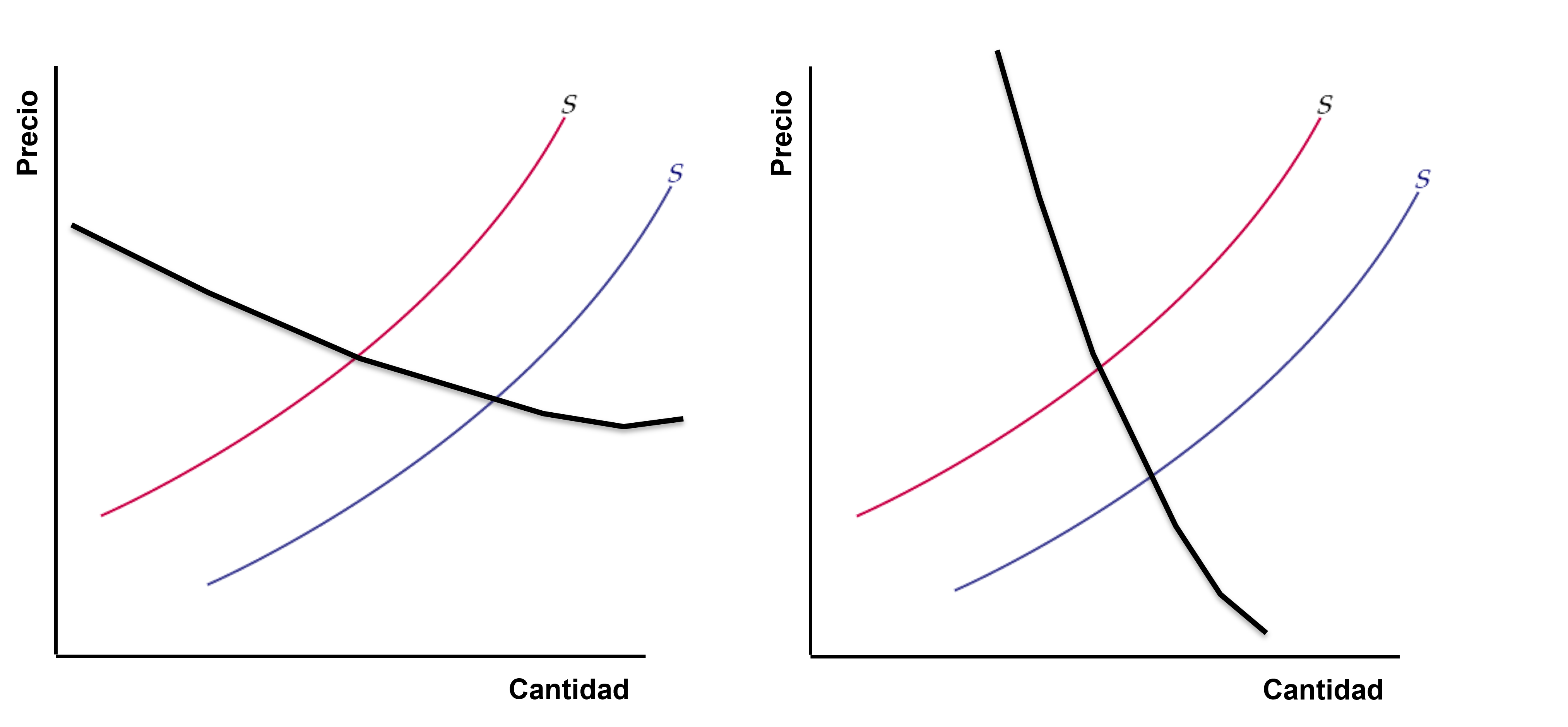 Es de resaltar que el resultado final de las variaciones en el equilibrio, en términos de cuánto crecerá o no el precio o la cantidad, dependerá de la pendiente de las curvas y de cuánto cambie la curva. Veamos, por ejemplo, el caso del desplazamiento de la oferta a modo de ilustración. Si la demanda es más plana (lado izquierdo), se tendrá mayor variación en la cantidad.