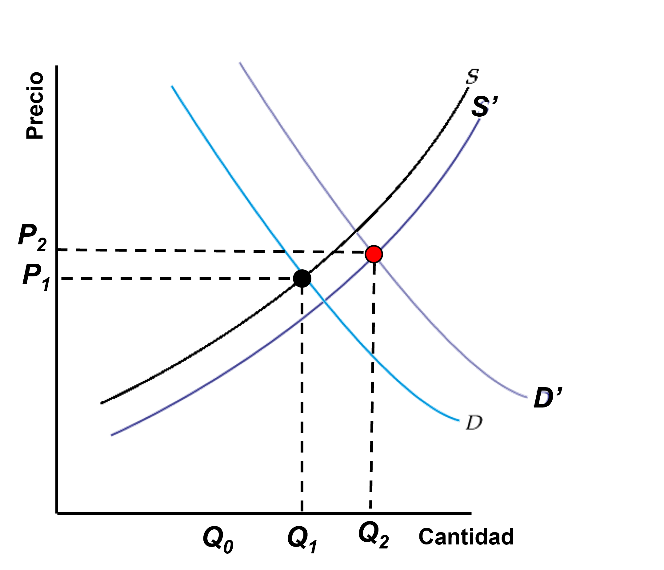 En el ejemplo particular presentado en la figura, al desplazar a la derecha la oferta y la demanda, el precio y la cantidad incrementan.