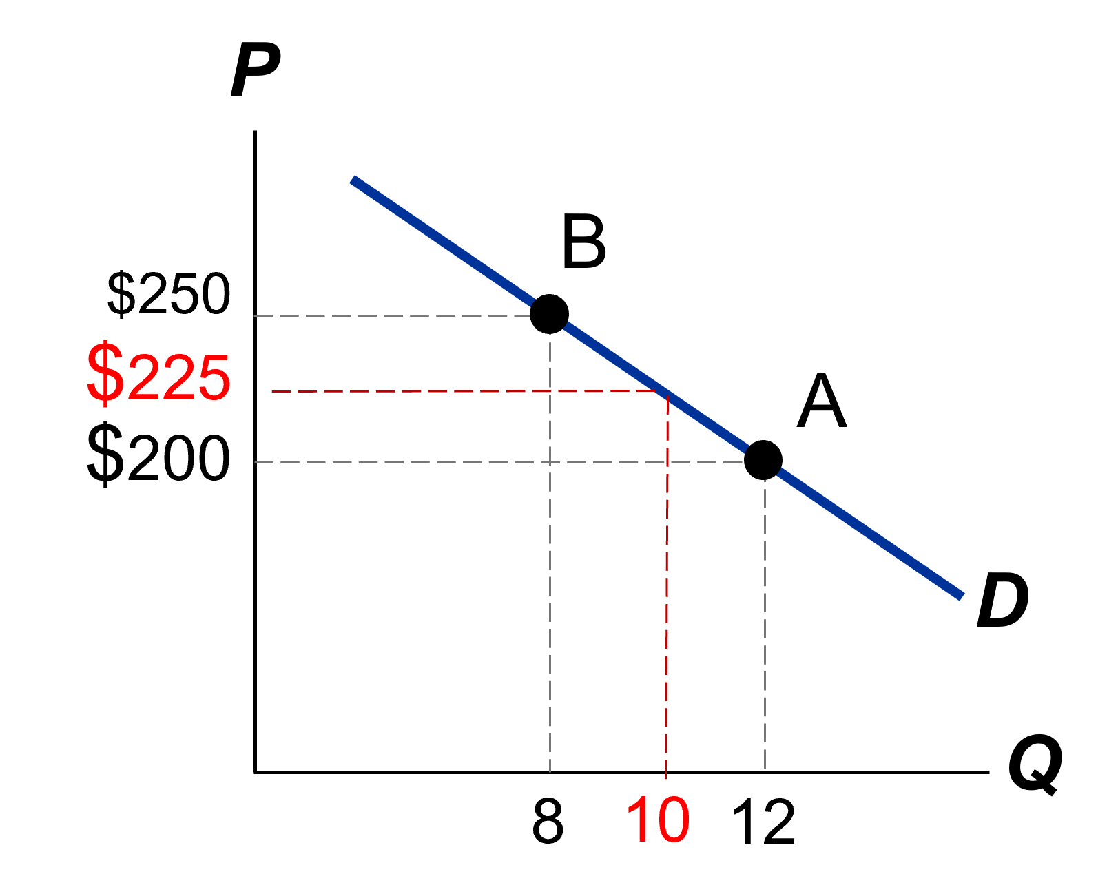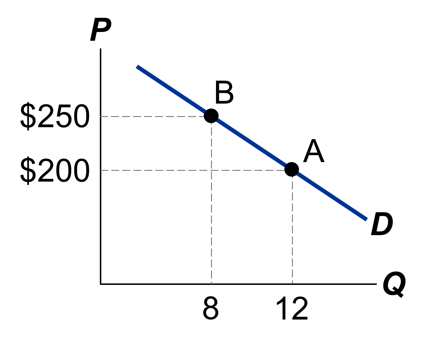 Ejemplo. Supona que a un precio inicial de $200 por kg de pan la cantidad que se demanda es de 12 Kilos. Al subir el precio a $250 la cantidad que se demanda (cae y ) pasa a ser de 8 Kg.