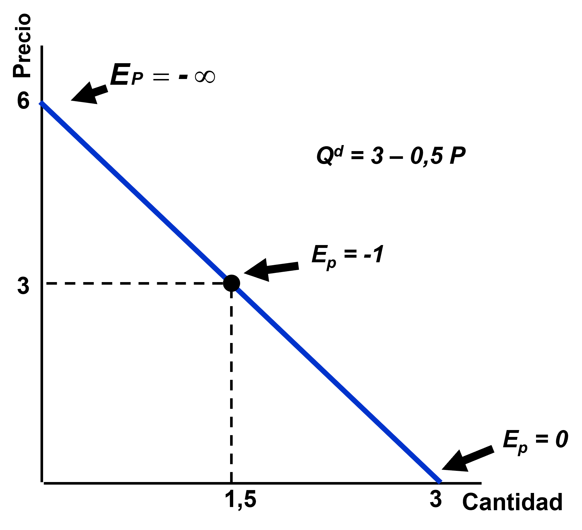 En una curva de demanda lineal como la del ejemplo, \(Q^d=3−0,5\cdot P\), la elasticidad cambia a lo largo de la recta: