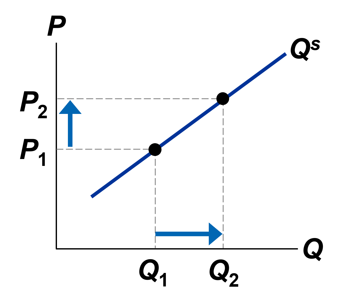 \[\boldsymbol{Q^s=Q^s(\underbrace{P}_{ \color{red}{(+)} })}\] Por ejemplo, \(Q^s=1,5+0,25\cdot P\)
