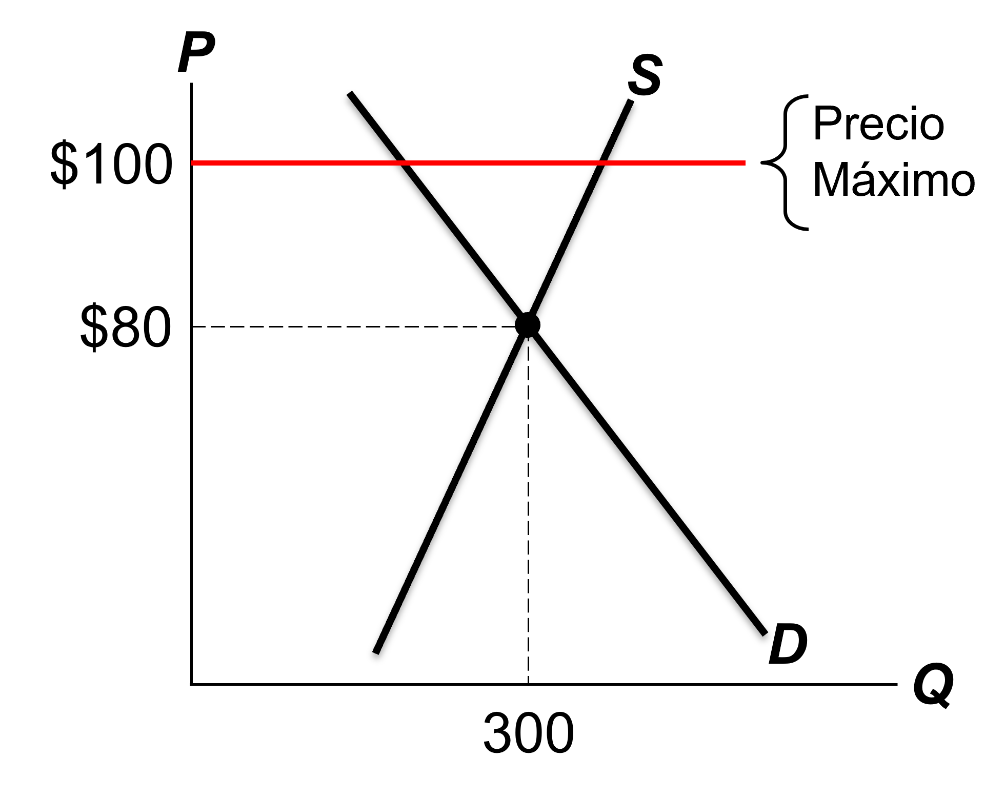 Un precio máximo por encima del precio de equilibrio NO es vinculante. Es decir, no tiene ningún efecto sobre el resultado del mercado.