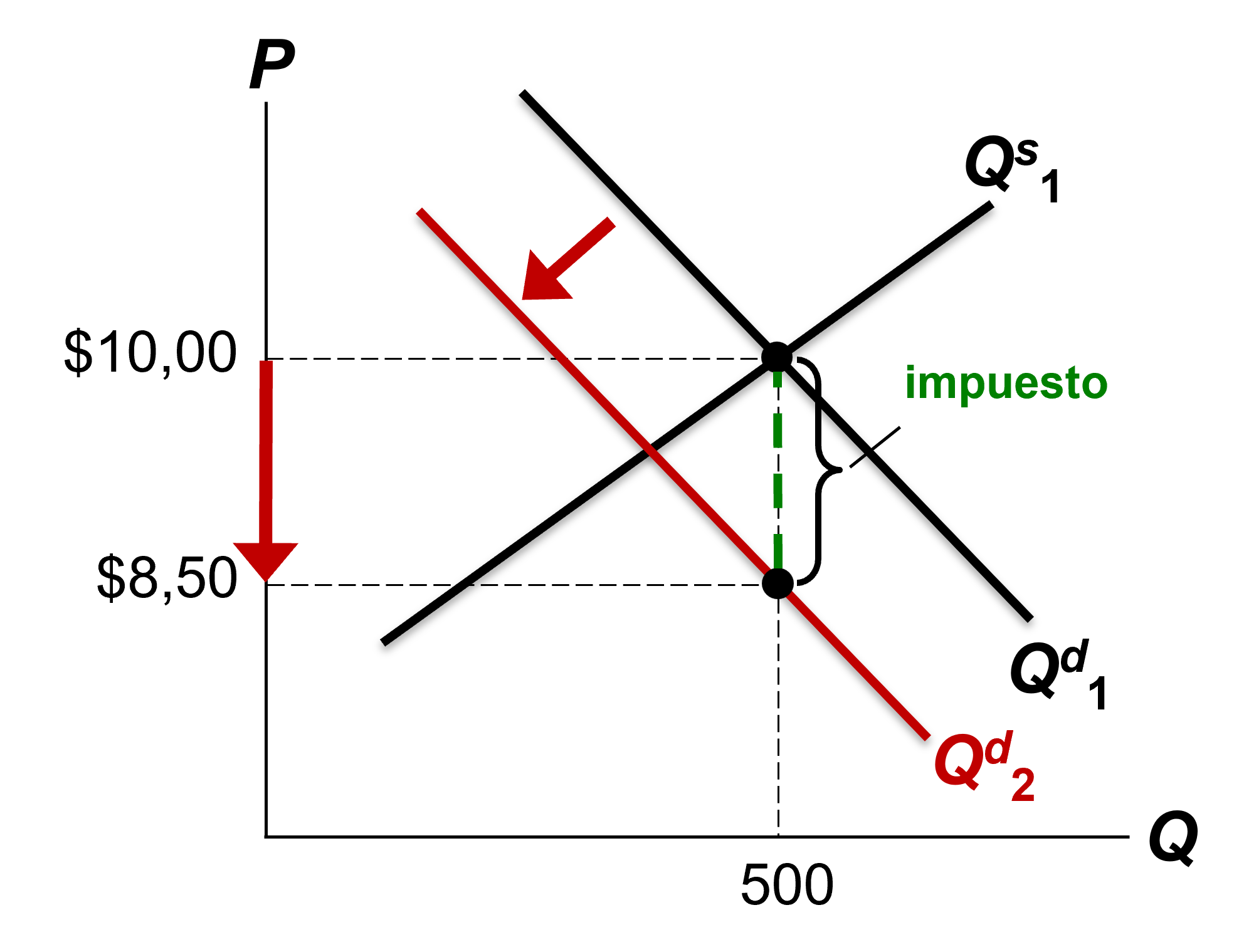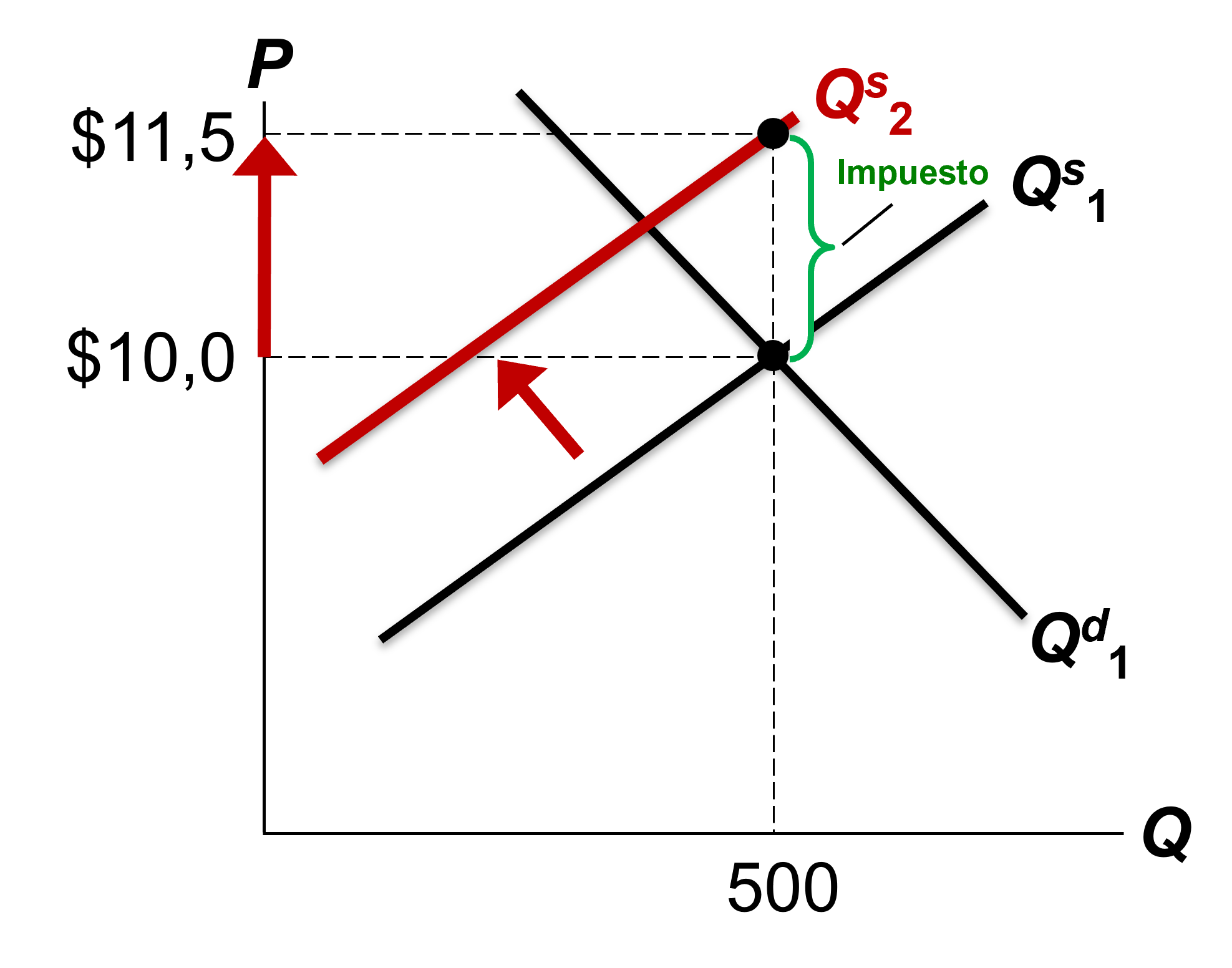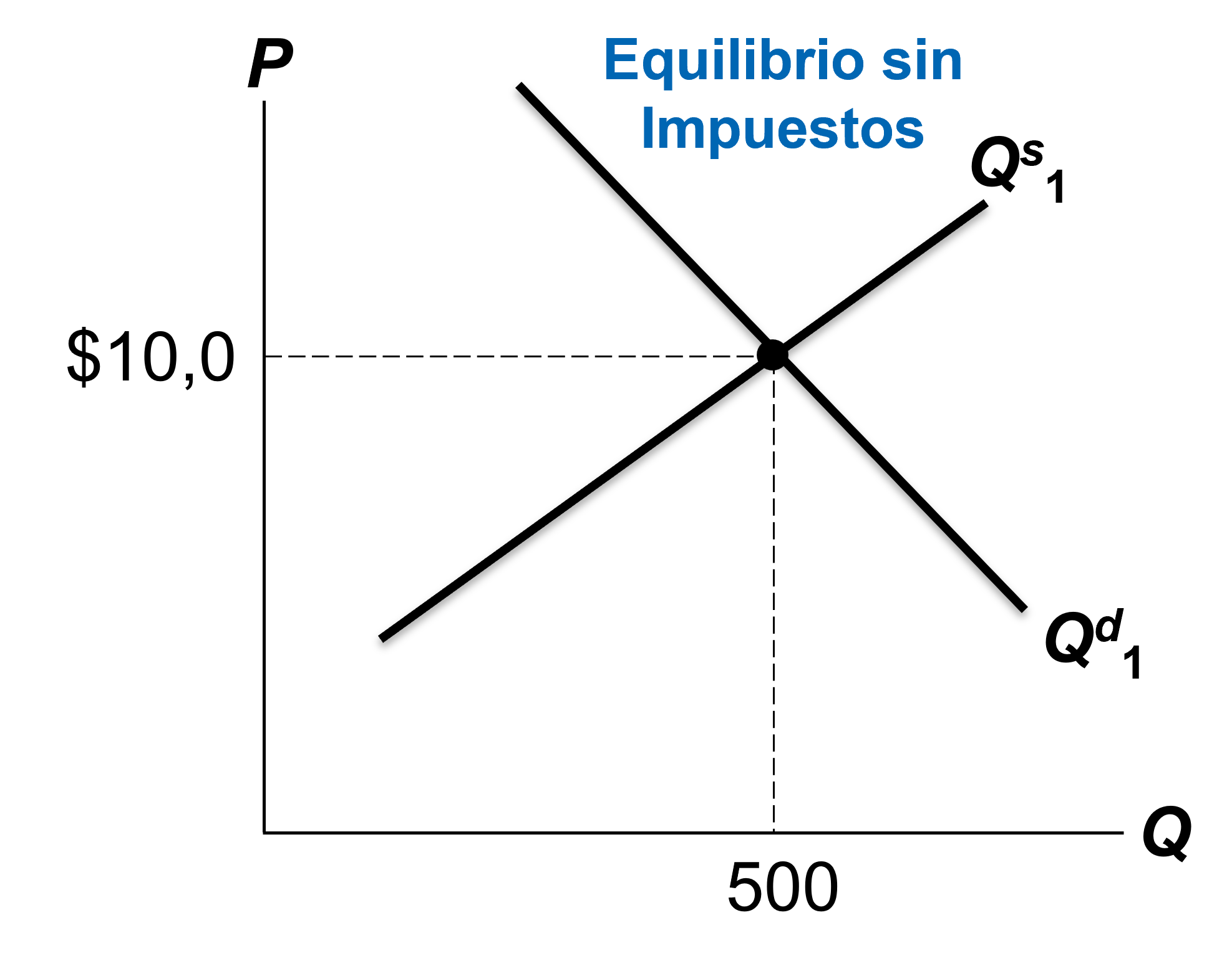 Ejemplo. Supongamos un mercado cuyo precio y cantidad de equilibrio (sin impuestos) son $10 y 500, respectivamente.