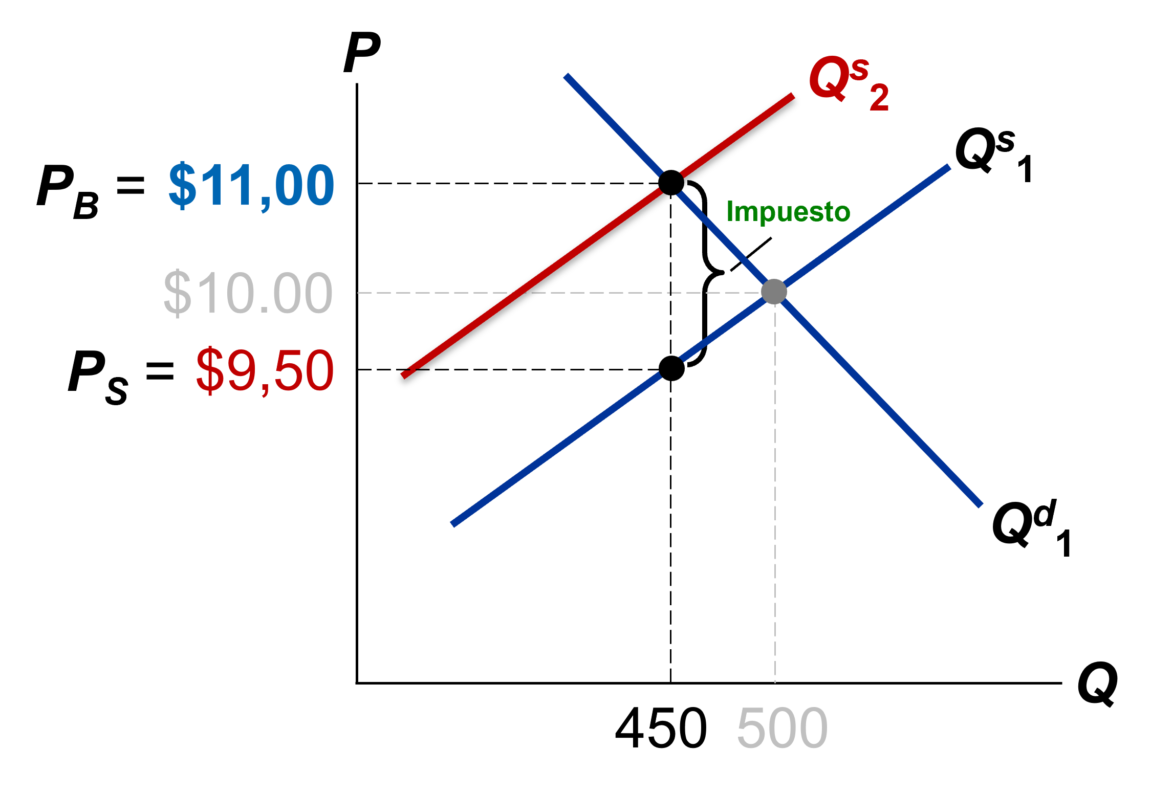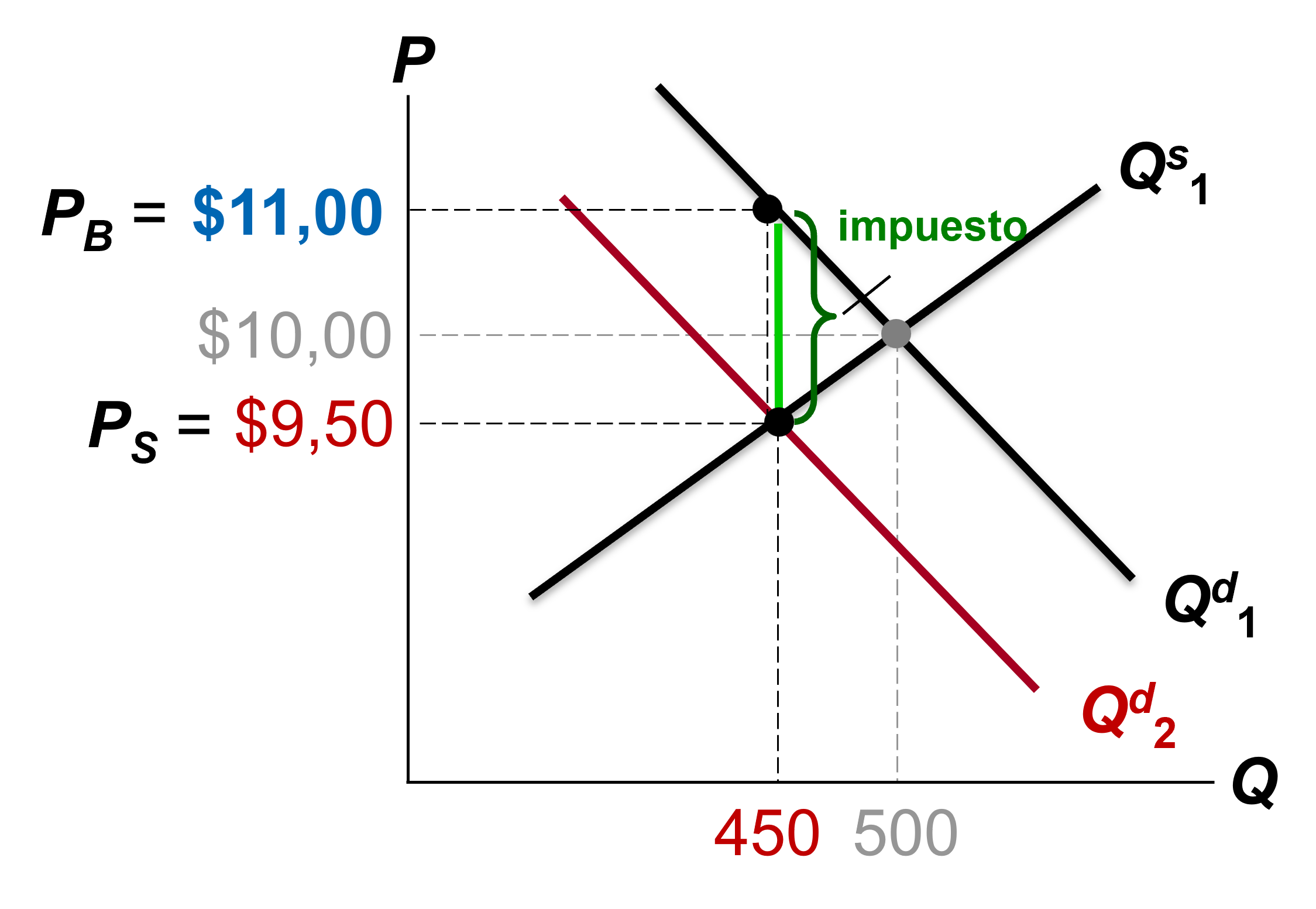 El nuevo equilibrio se da en Q = 450, para el cual los vendedores reciben \(P_s = \$9,5\) y los compradores pagan \(P_B = \$11,0\)