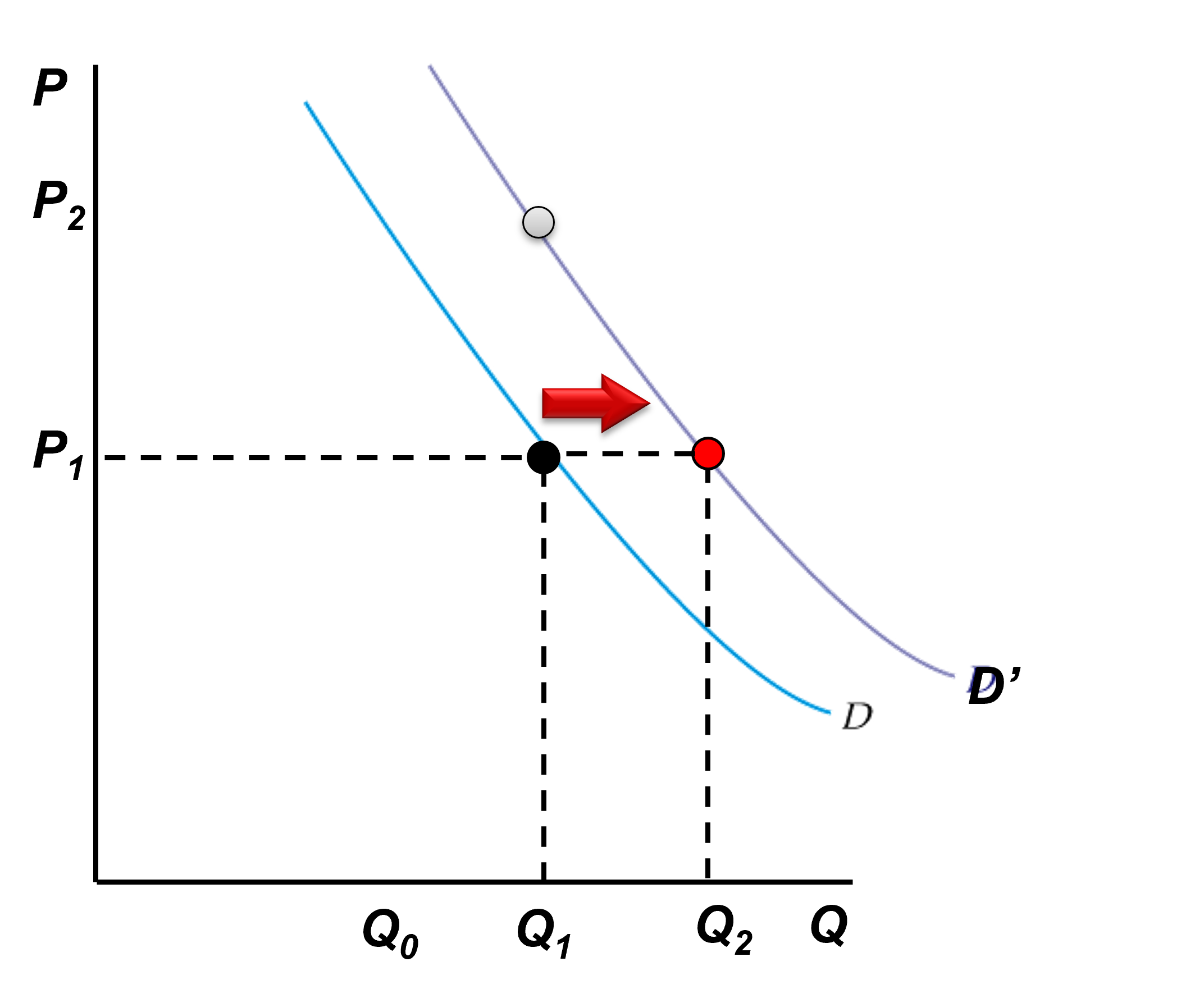 Un ingreso más alto permite acceder a más bienes, por lo que (bajo condiciones normales) se representa con un desplazamiento de la curva de demanda hacia la derecha (desde D a D’) como muestra la figura.