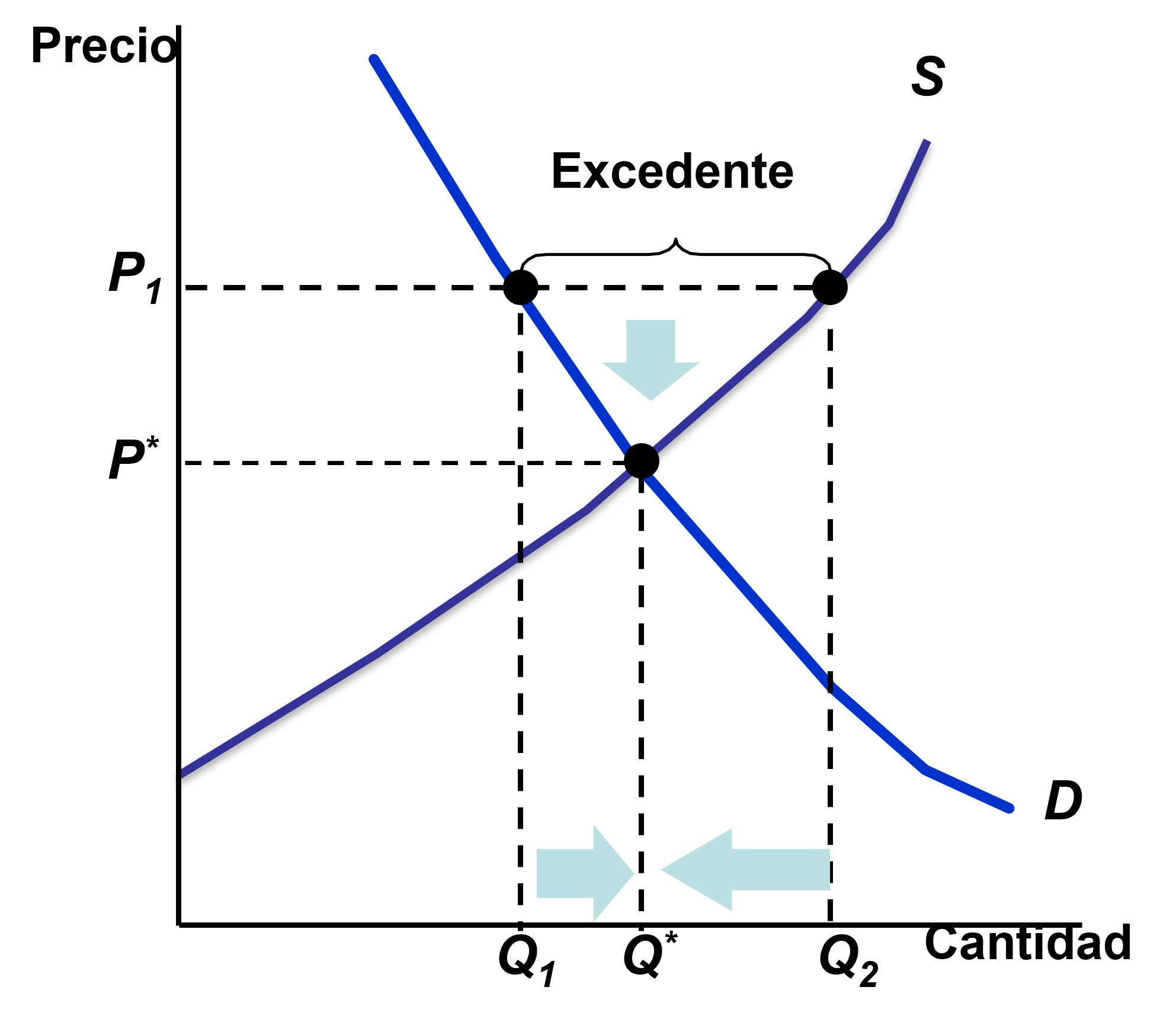 Si el precio se encuentra por encima de \(P^*\) (es decir, el precio está por encima del precio que vacía el mercado):