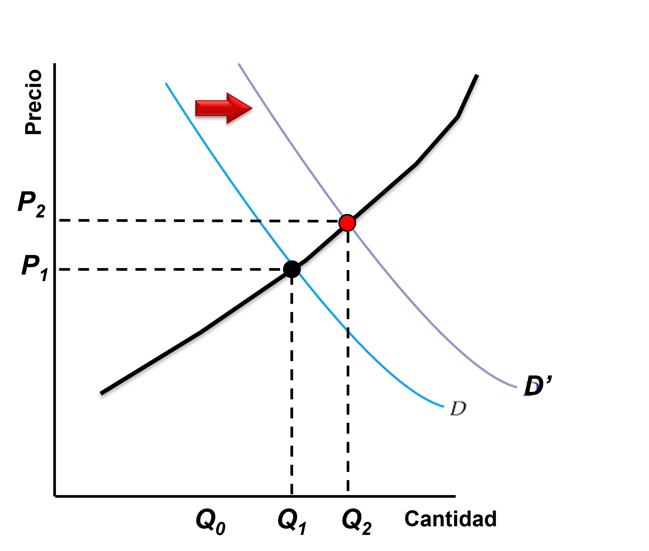 Cuando la curva de demanda se desplaza a la derecha, el mercado se vacía a un precio más alto y una mayor cantidad. Es decir, \(\uparrow P\) y \(\uparrow Q\).