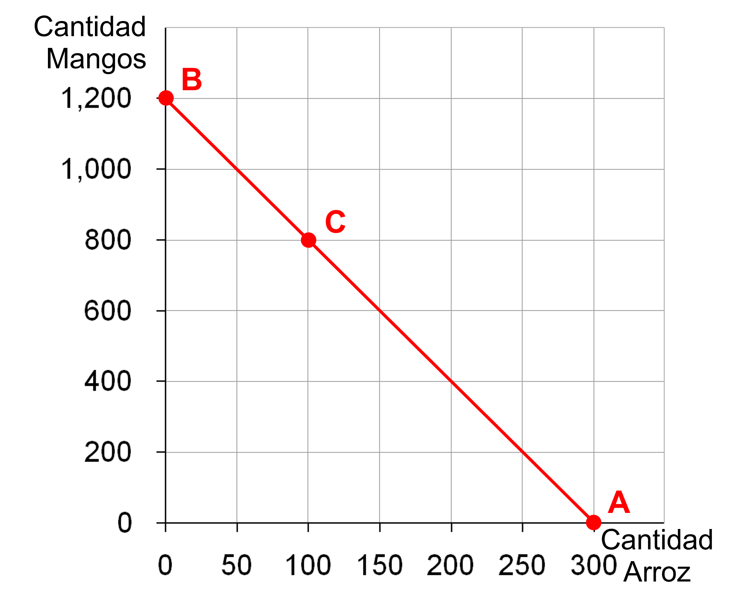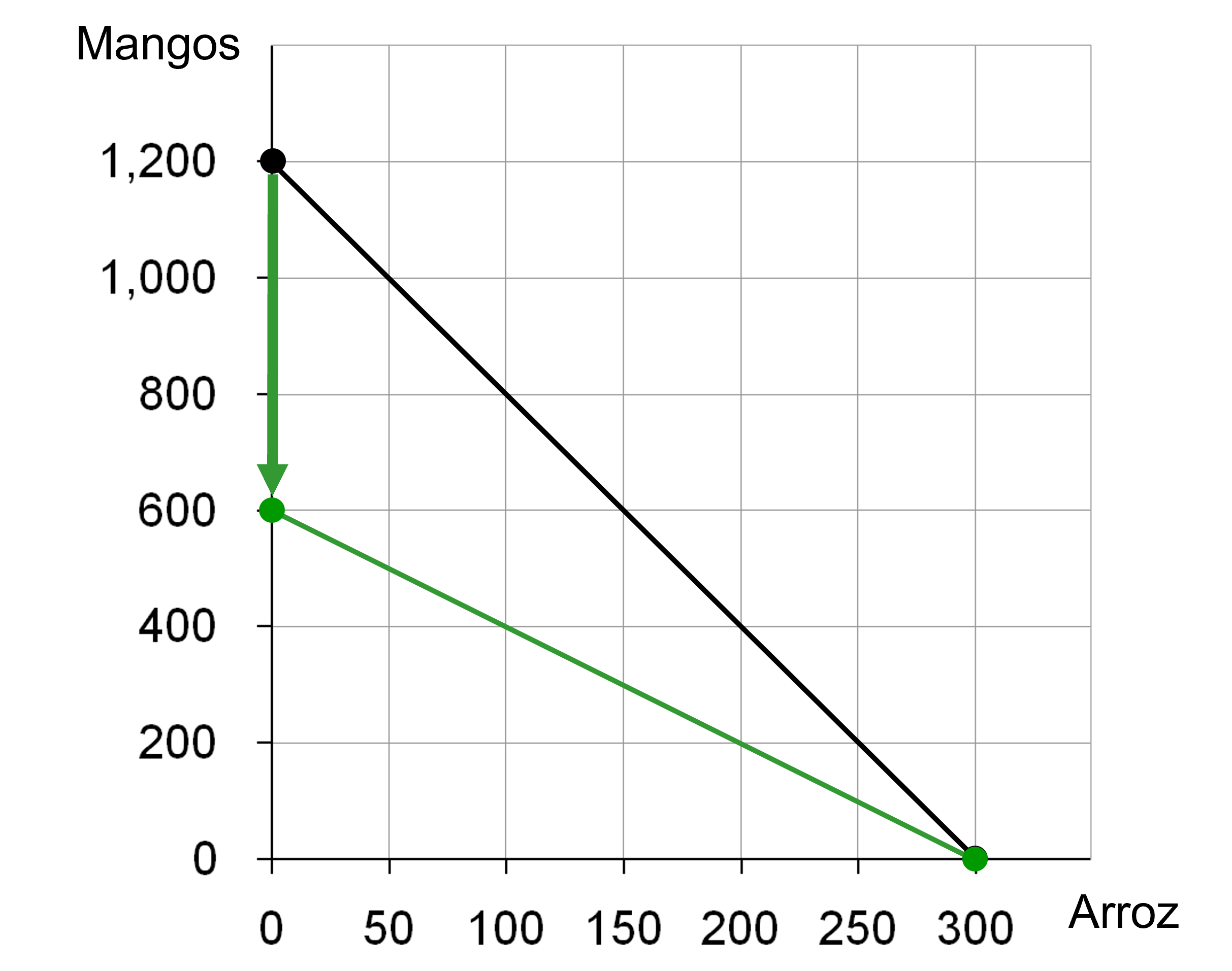 Ejemplo: Supongamos en el ejemplo de magos y arroz que ahora que el precio de los mangos sube a $2. ¿Cómo cambia el gráfico?