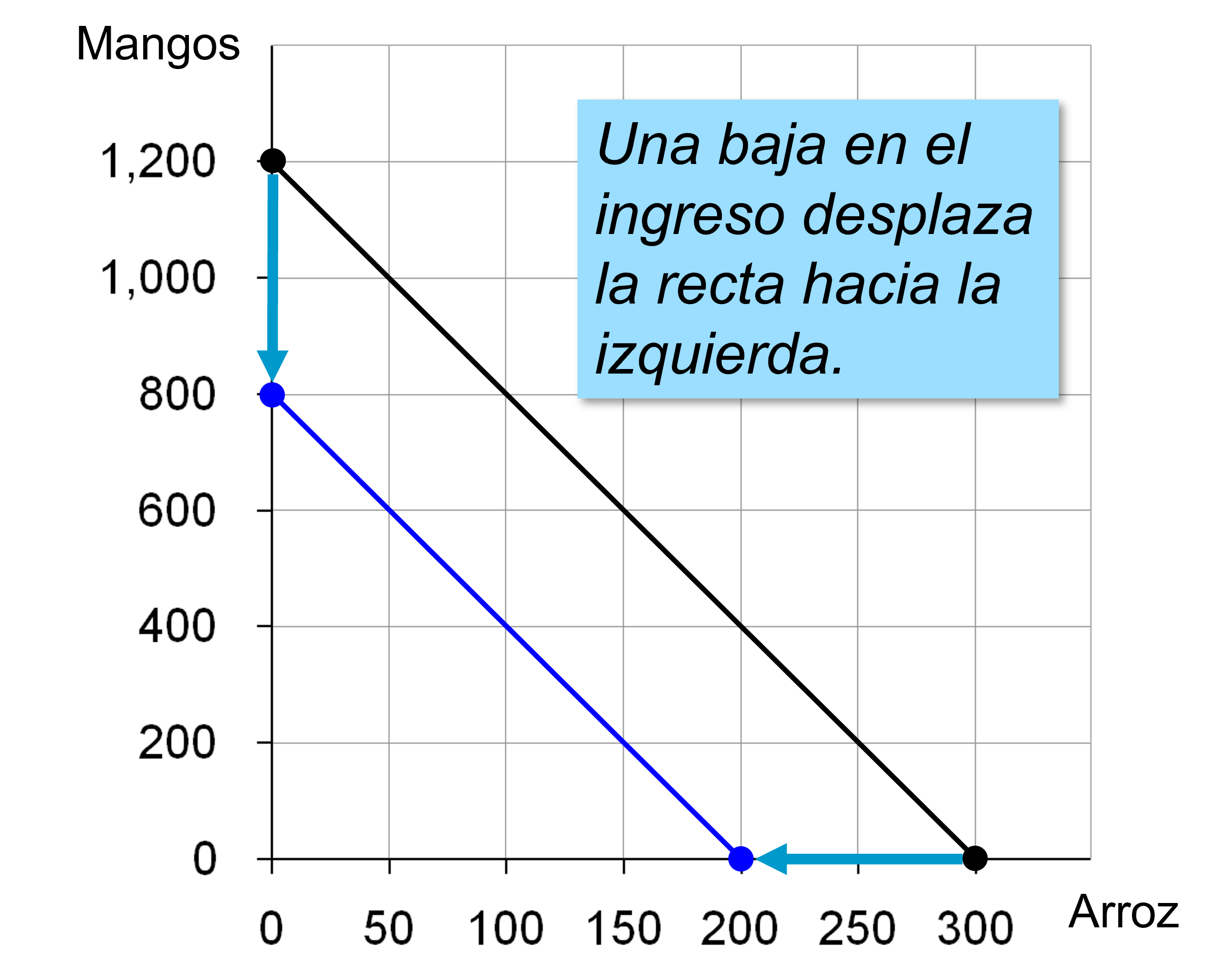 Ejemplo: Supongamos en el ejemplo de magos y arroz que ahora que el ingreso total baja a $800. ¿Cómo cambia el gráfico?