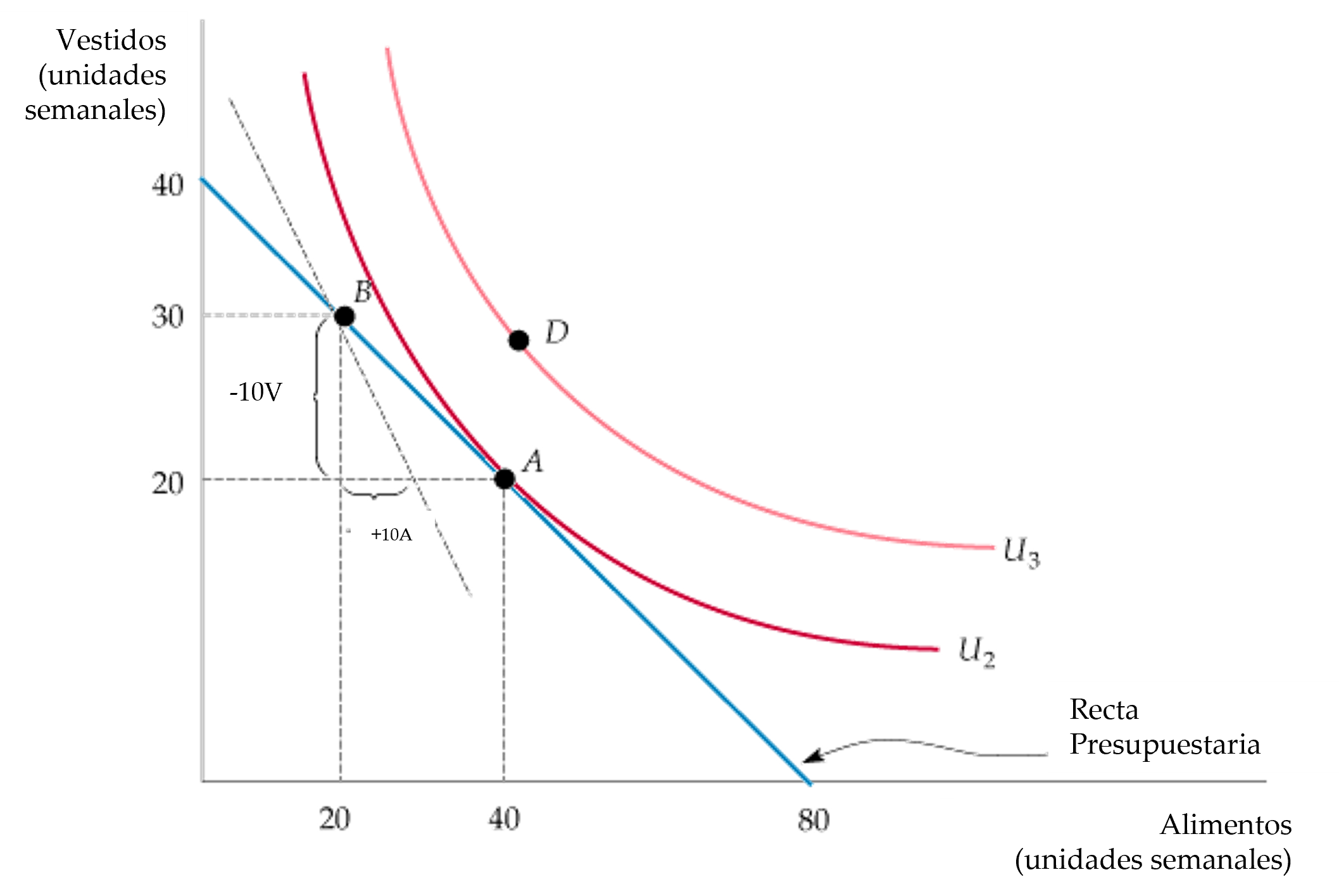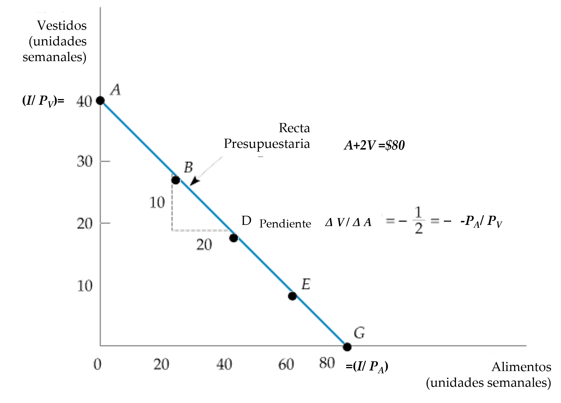 Por ejemplo, para los bienes Vestido (V) y Alimento (A), el gasto en cierta cantidad de bienes (A,V), cuyos precios son \(P_A=\$1\) y \(P_V=\$2\), es cubierto con un ingreso de $80: \[P_V V + P_AA =I \hspace{2cm}\rightarrow\hspace{2cm} A+2V=\$80\]