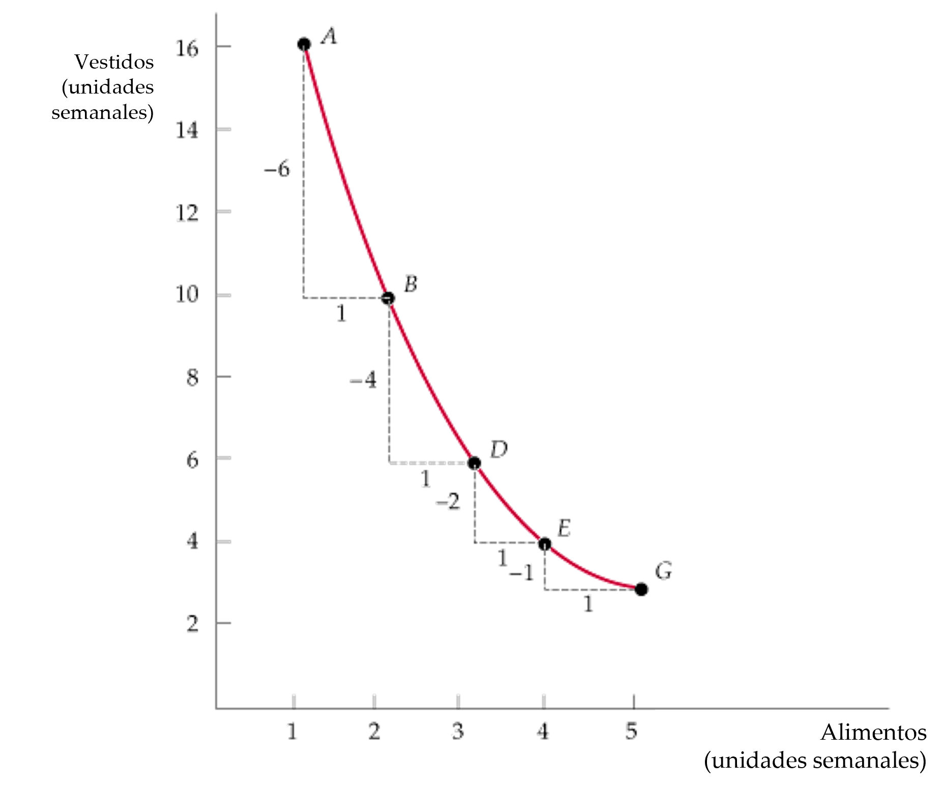 Relación Marginal de Sustitución (RMS) Cantidad máxima de un bien a la que está dispuesta a renunciar una persona para obtener una unidad más de otro.