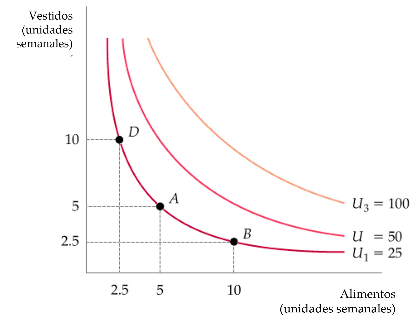 Esta figura muestra tres curvas de indiferencia (cuyos niveles de utilidad son 25, 50, y 100, respectivamente) relacionados con la función de utilidad AC: \[U(V,A)=V\cdot A\]