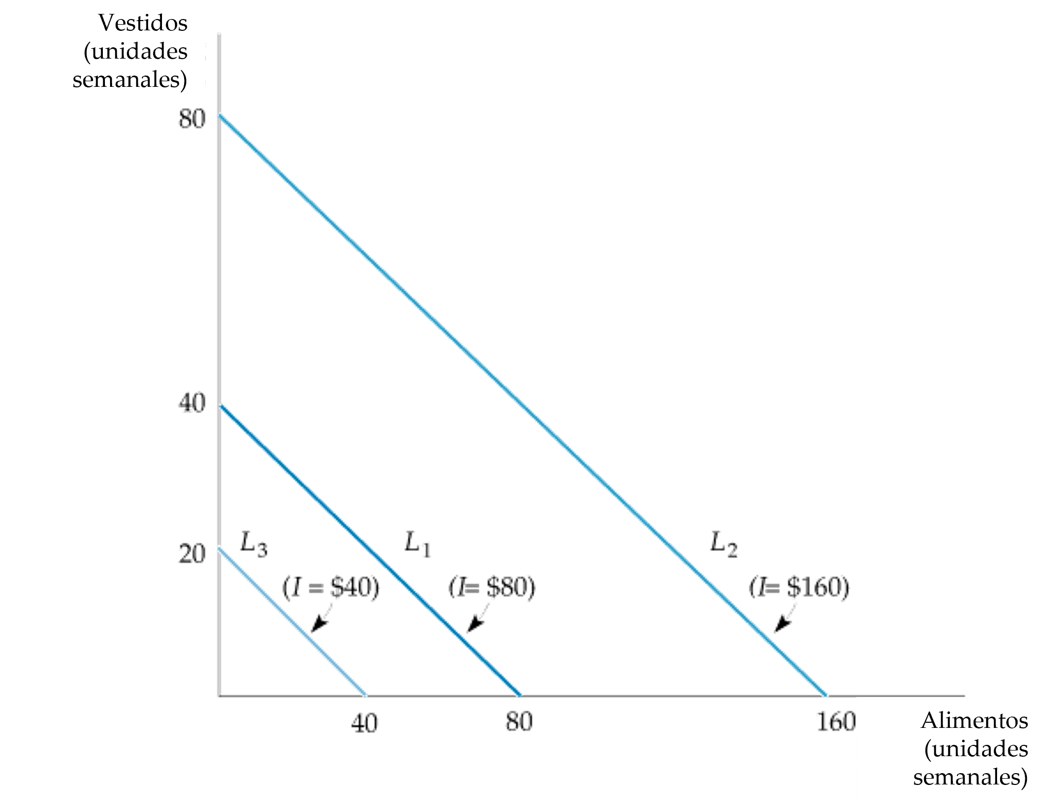 Figura: Efectos de una Variación de la Renta en la Recta Presupuestaria
