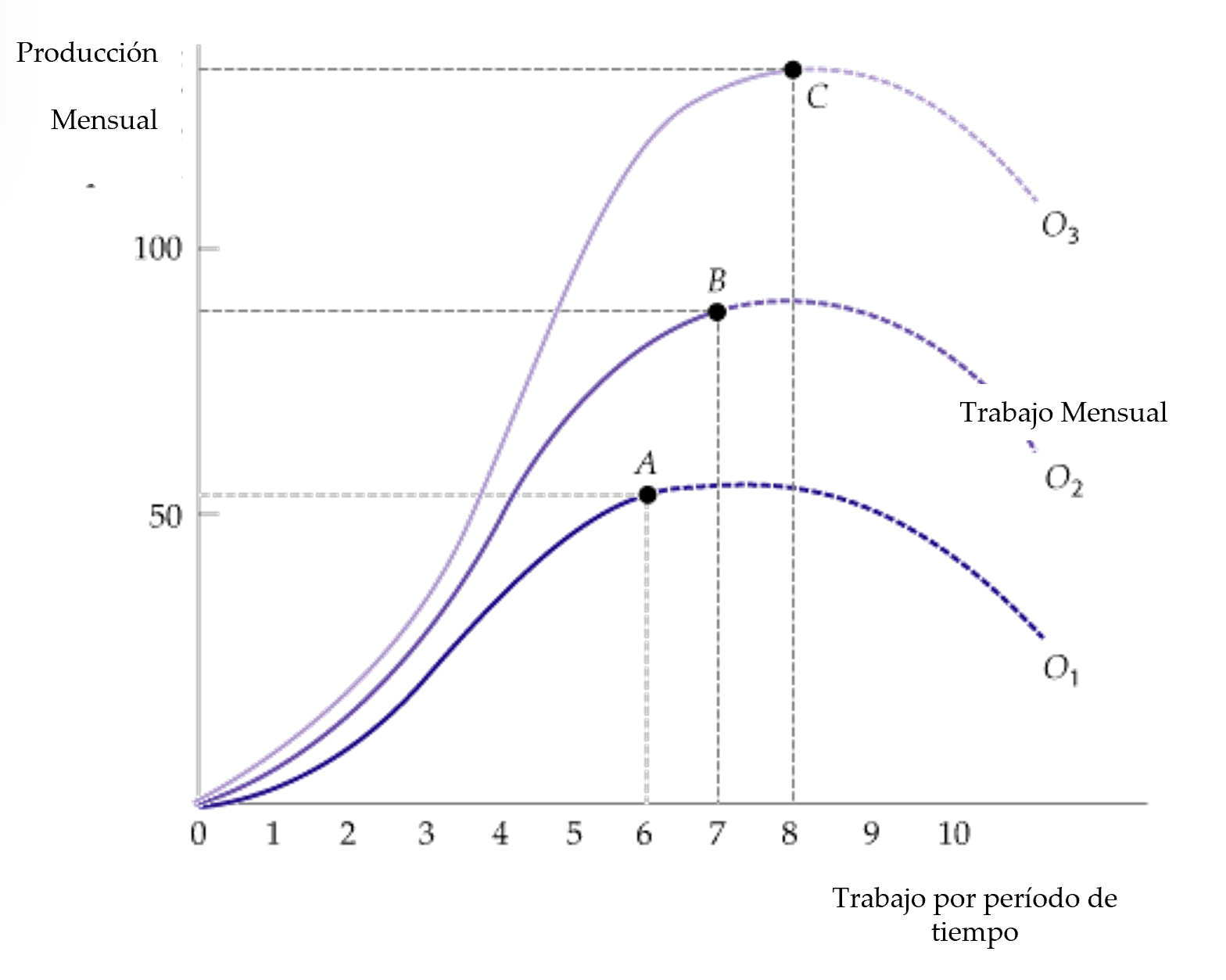 Producto medio: Producto medio por unidad de un determinado factor, \[\text{Producto medio del trabajo}=PMe_{L}=\frac{Producto}{Cantidad de Trabajo}=\frac{Y}{L}=\frac{F(K,L)}{L}\]