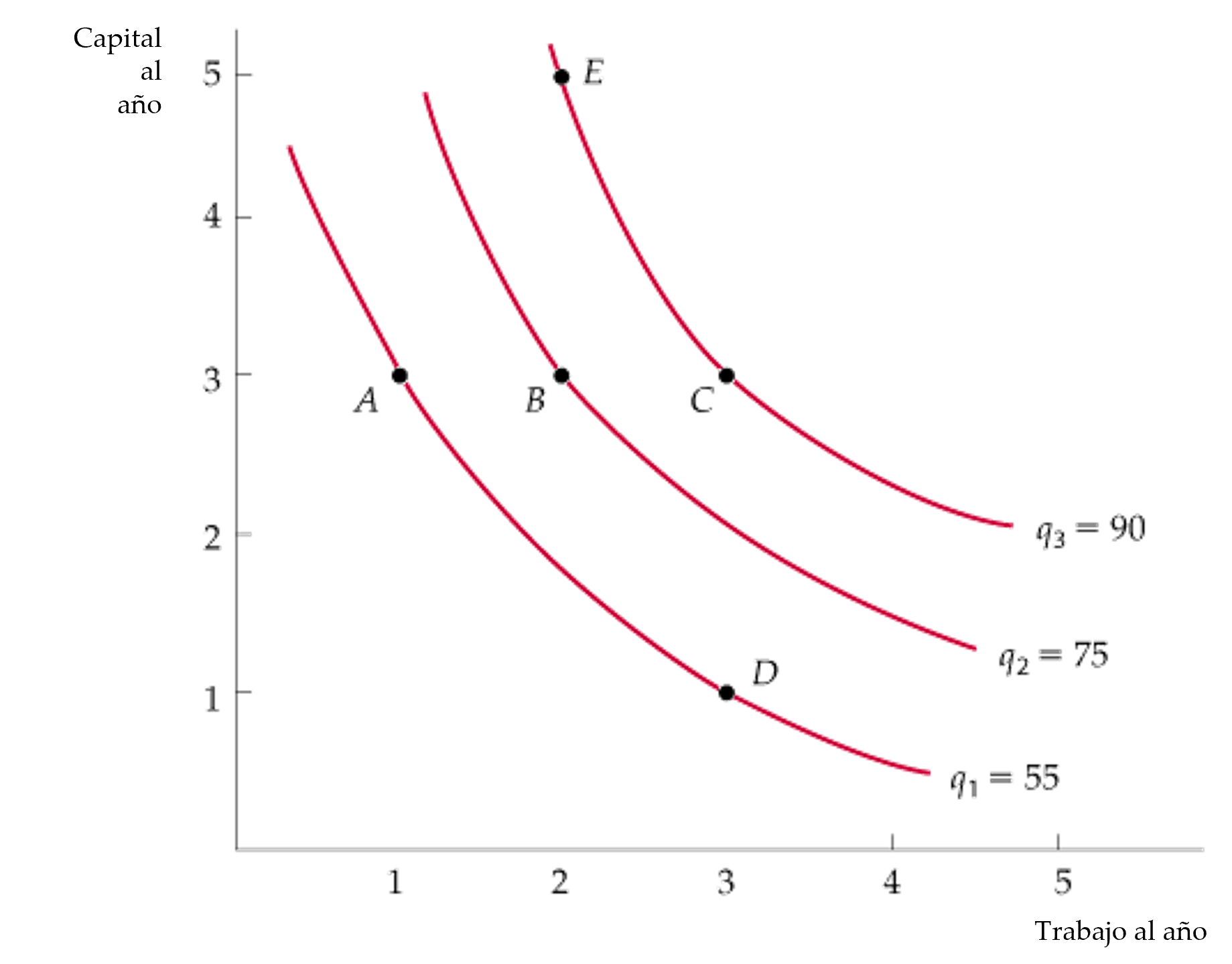 mapa de isocuantas gráfico que muestra varias isocuantas utilizadas para describir una función de producción.