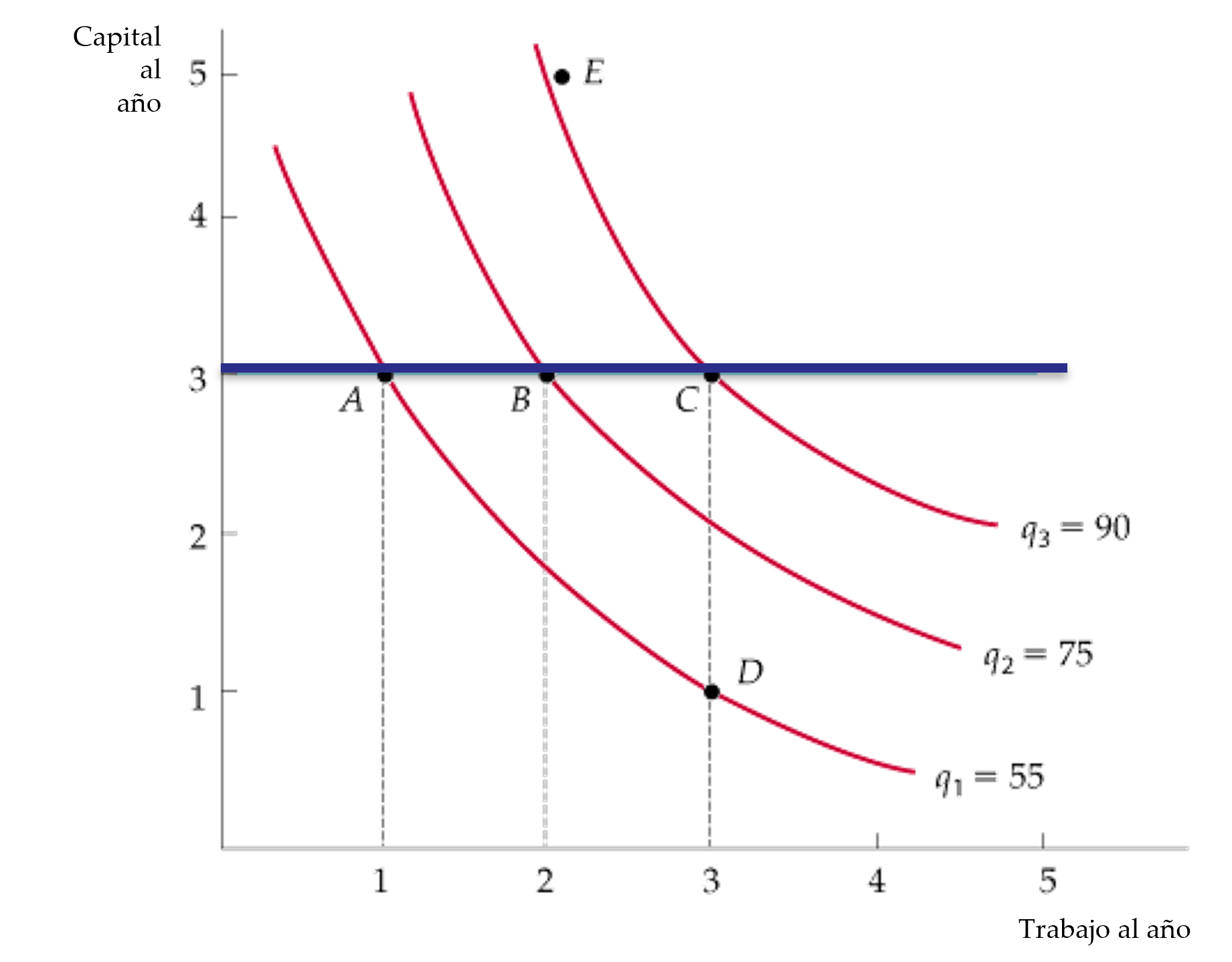 Si fijamos el nivel de capital, digamos que en \(K=3\), se observa los niveles de producción de cada isocuanta a medida que se incrementa el trabajo, vemos que cada unidad de trabajo genera una cantidad de producción que aumenta cada vez menor.
