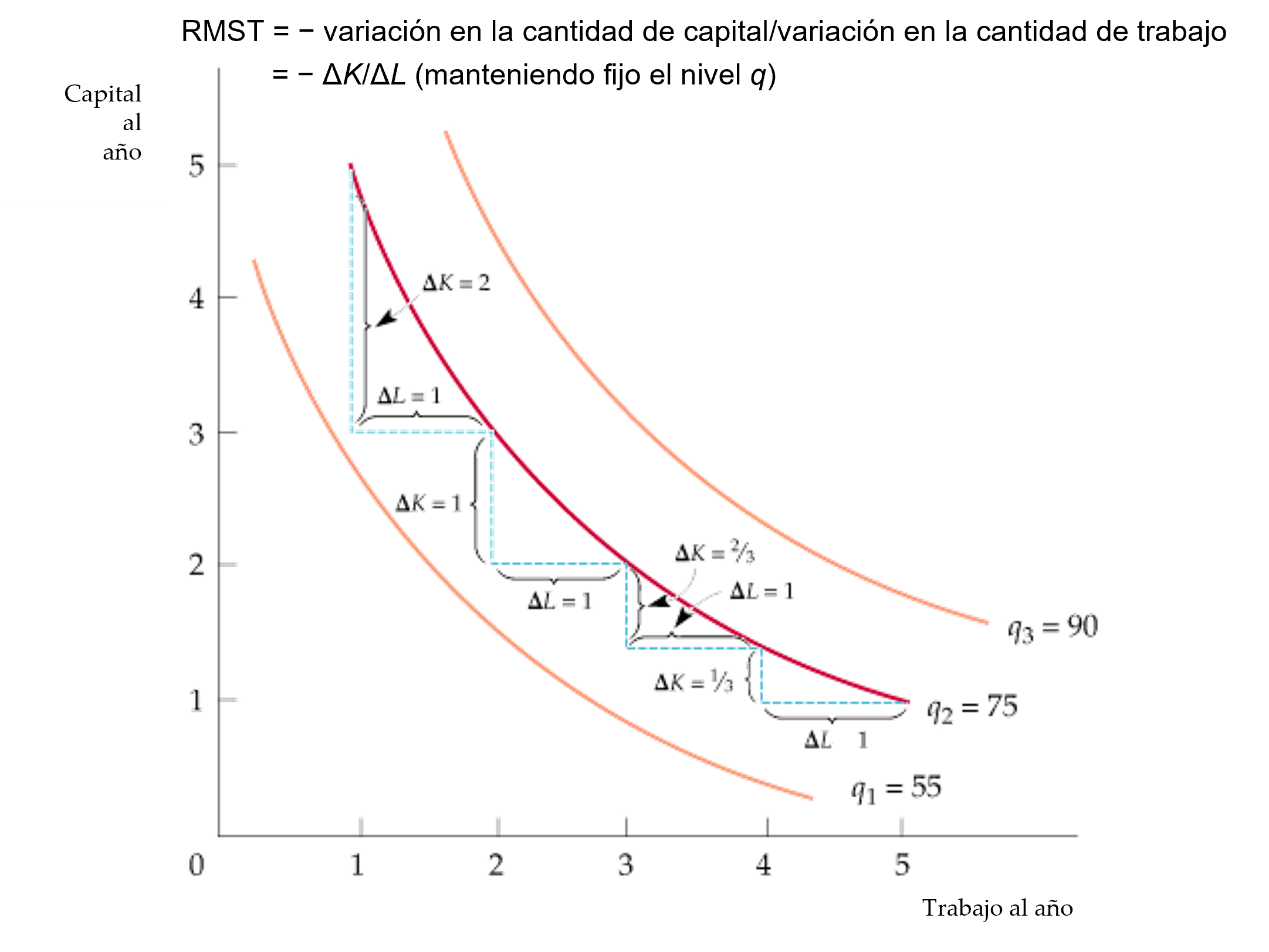 relación marginal de sustitución técnica (RMST) cantidad en que puede reducirse uno de los factores cuando se utiliza una unidad más de otro, por lo que la producción permanece constante.
