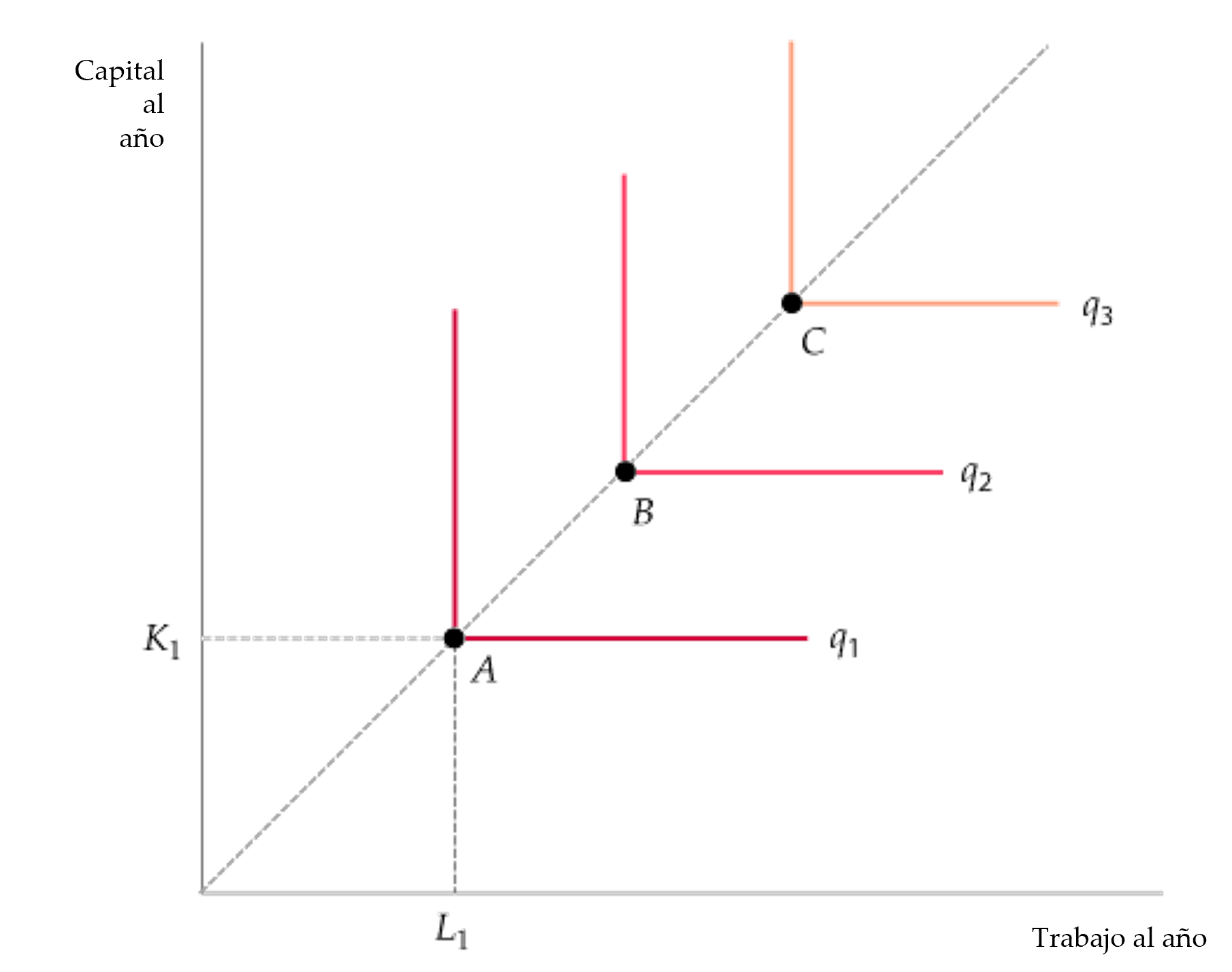 Figura: Las isocuantas cuando los factores son de proporciones fijas