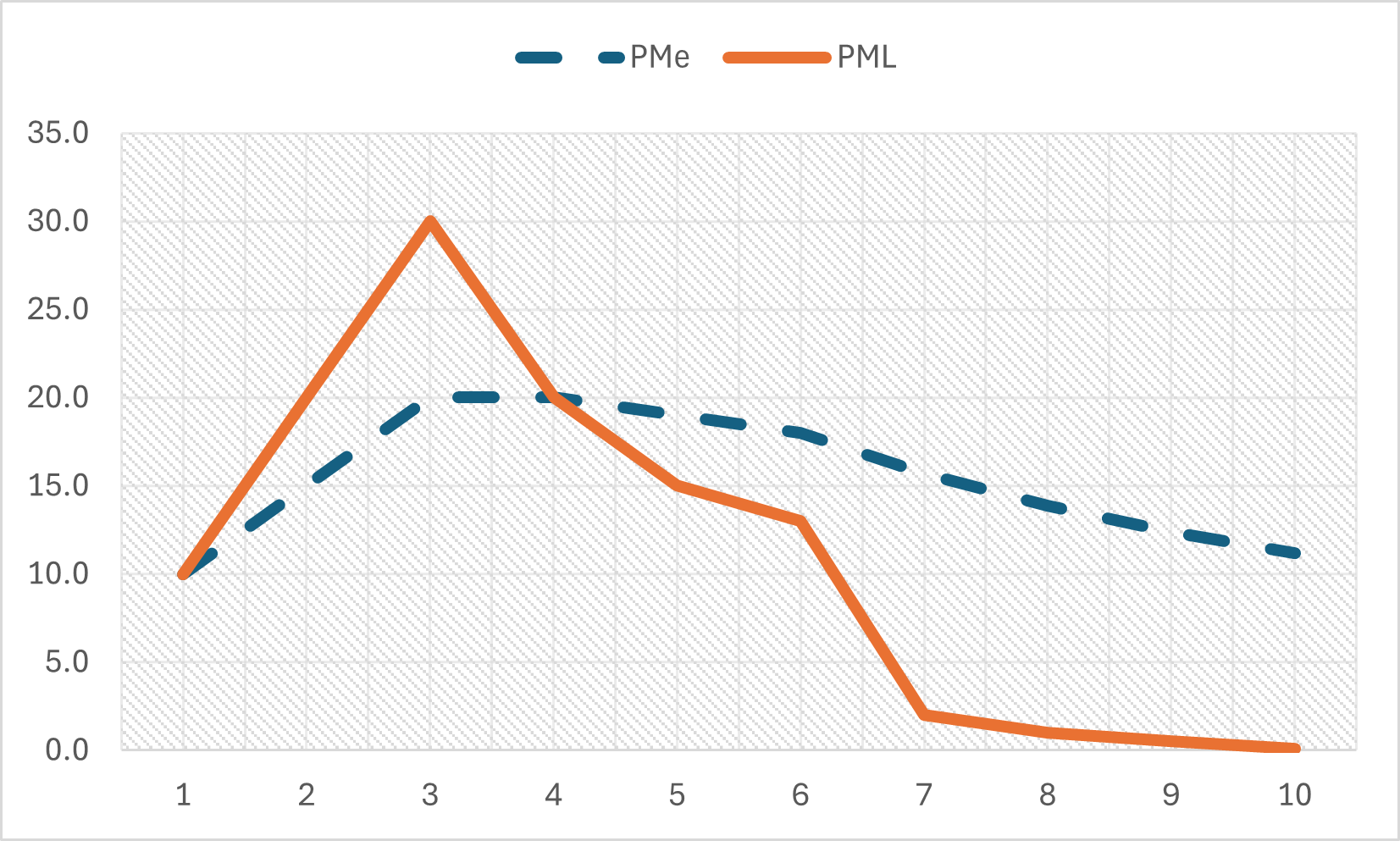 \[ \begin{array}{|c|c|c|c|c|} \hline \textbf{L} & \textbf{K} & \textbf{Y} & \textbf{PMeL} & \textbf{PML} \\ \hline 0 & 10 & 0 & - &- \\ 1 & 10 & 10 & 10/1=10&(10-0)/(1-0)=10/1=10 \\ 2 & 10 & 30 & 30/2=15&(30-10)/(2-1)=20/1=20 \\ 3 & 10 & 60 & 20& 30\\ 4 & 10 & 80 & 20& 20\\ 5 & 10 & 95 & 19& 15\\ \hline \end{array} \]