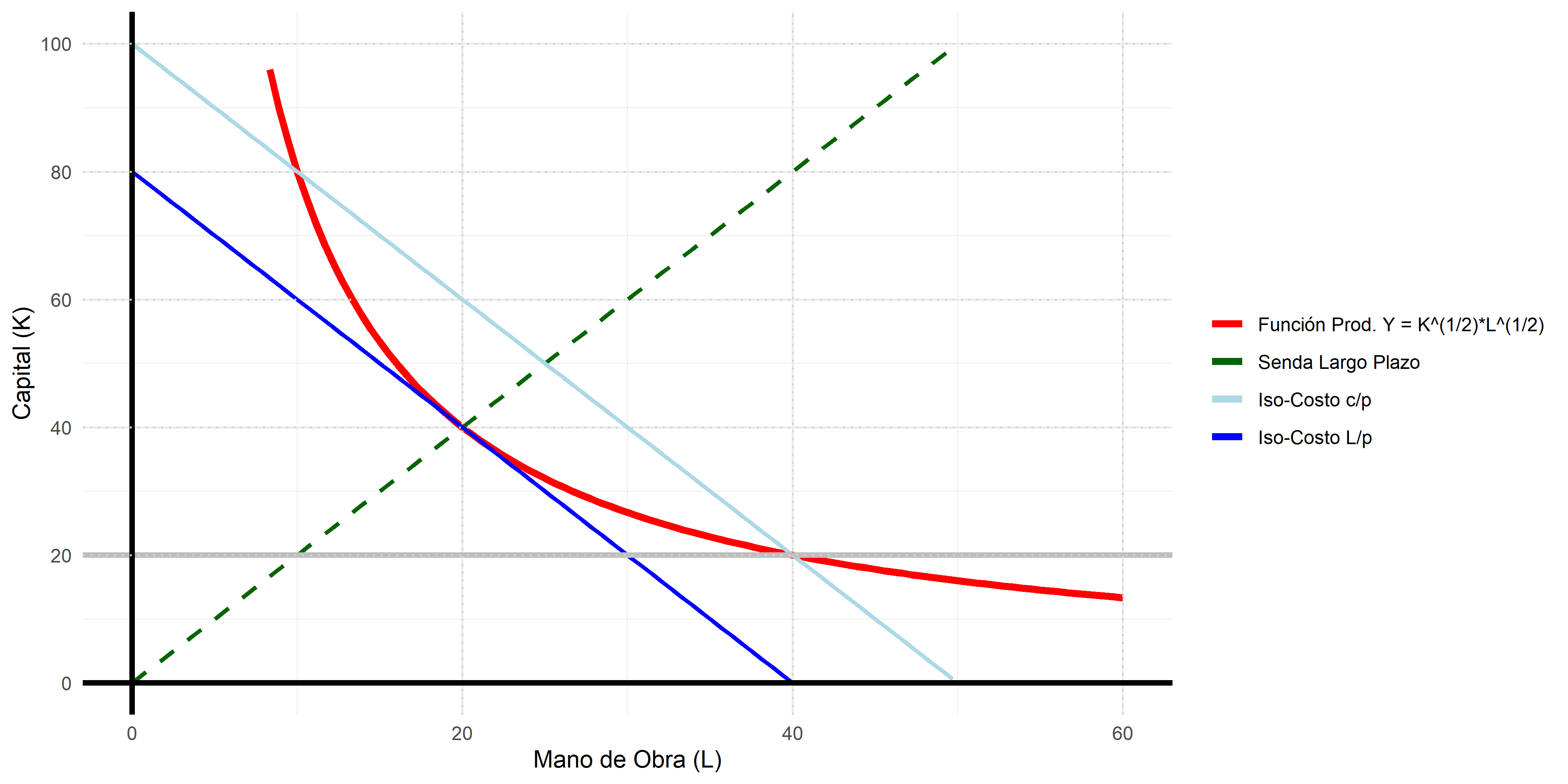 Además, los precios de la mano de obra son \(w=2\) y del capital \(1\). Si la empresa desea producir una cantidad \(Y=20\sqrt{2}\), encontrar los costos totales en los siguientes dos casos: