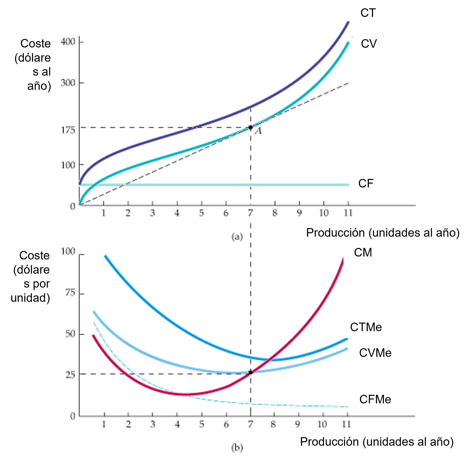 | Nivel de Producción (unidades anuales) | costo Fijo (CF) | costo Variable (CV) | costo Total (CT) | costo Marginal (CM) | costo Fijo Medio (CFMe) | costo Variable Medio (CVMe) | costo Total Medio (CTMe) |