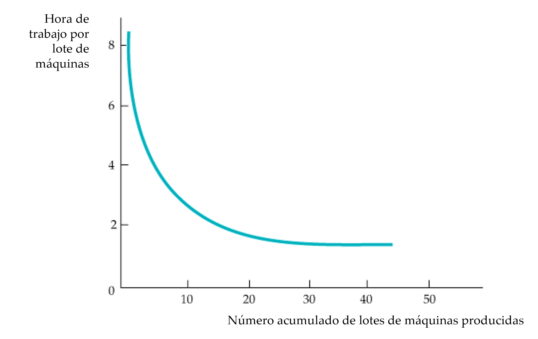 La curva de aprendizaje muestra el grado en que disminuyen las horas necesarias de trabajo por unidad de producción a medida que aumenta la producción acumulada.