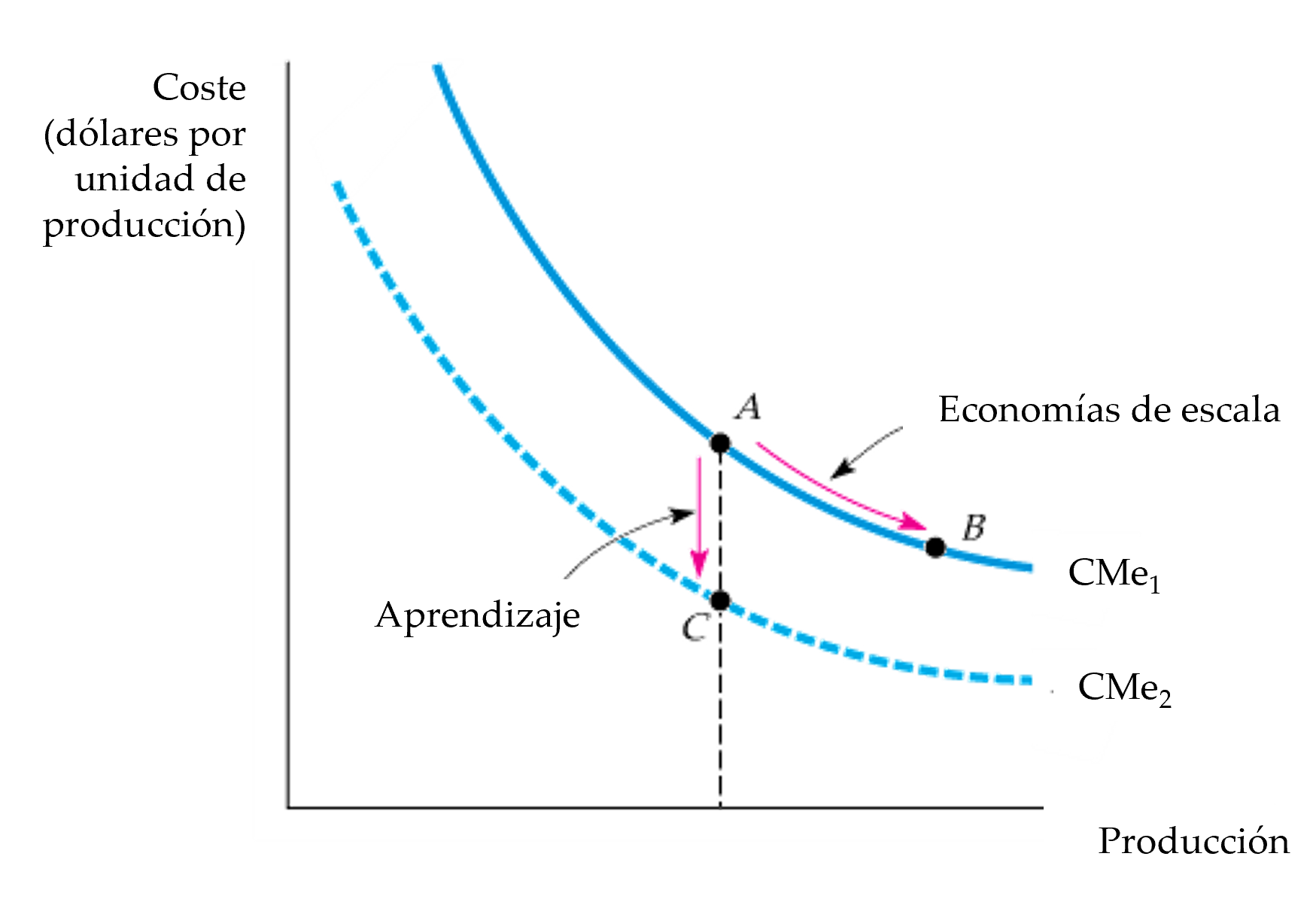 Aprendizaje vs Economías de Escala: El costo medio de producción puede disminuir con el tiempo debido al crecimiento de las ventas o por una curva de aprendizaje.