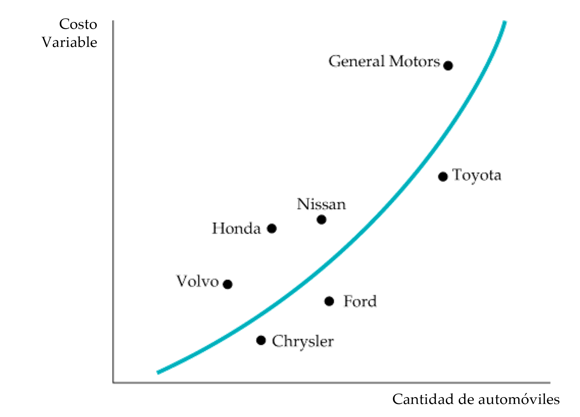 La curva de costo variable se obtiene determinando estadísticamente la curva que mejor ajusta los puntos que relacionan el nivel de producción de cada empresa y el costo variable de producción.
