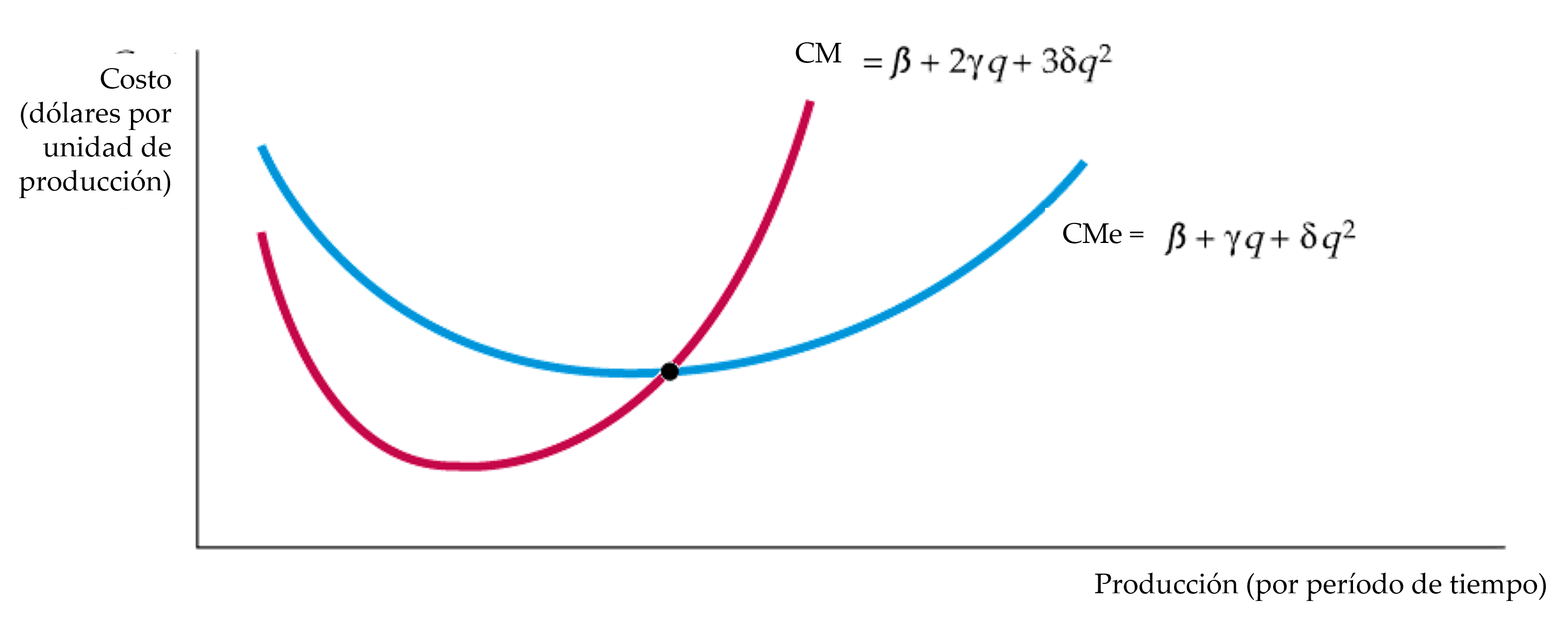 Si queremos que la curva de costo medio tenga forma de U y que el costo marginal no sea constante, debemos utilizar una función de costos más compleja. Una posibilidad es la función de costos cuadrática, que relaciona el costo variable con el nivel de producción y con el nivel de producción al cuadrado: \[CV=\beta q+\gamma q^2\]