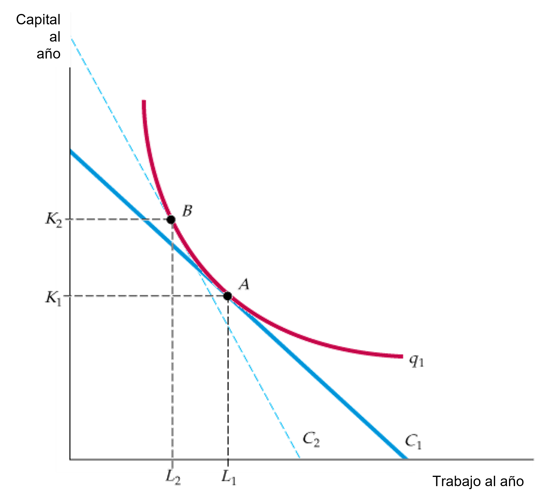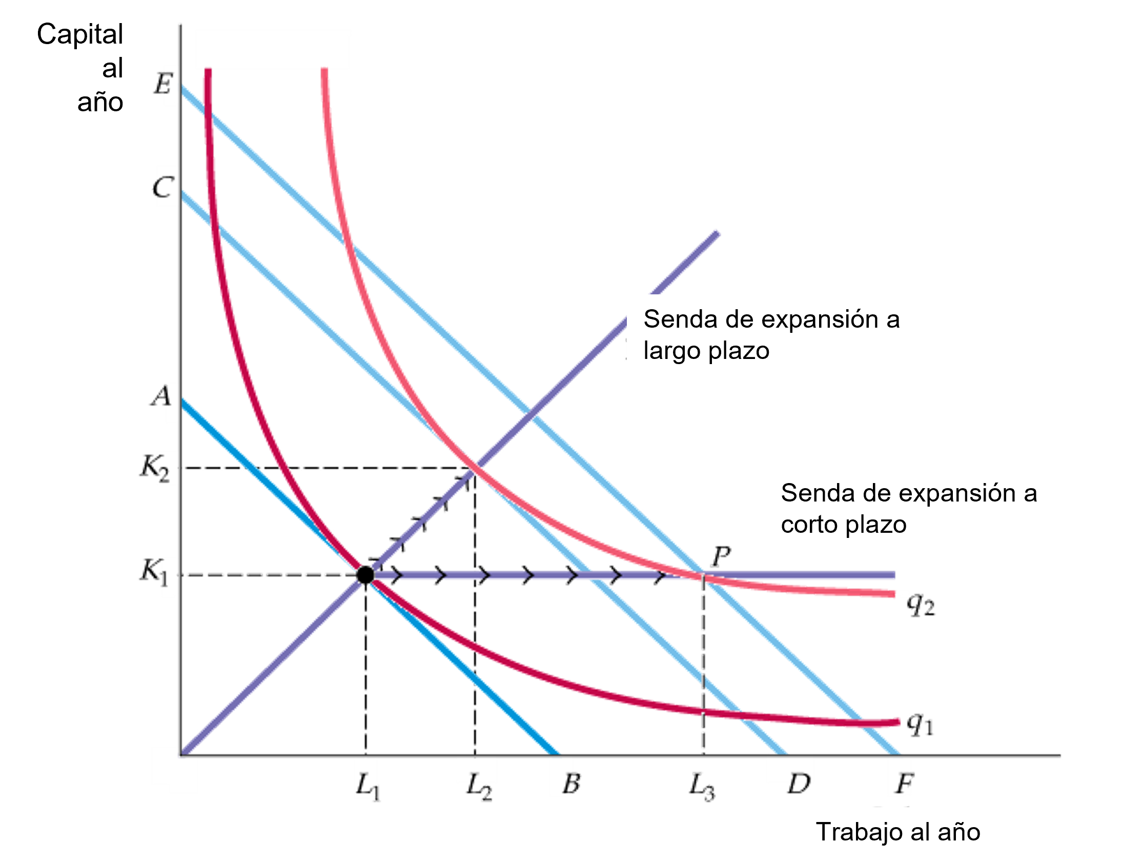 El nivel de producción inicial es \(q_1\). A corto plazo, solo se puede producir el nivel \(q_2\) elevando la cantidad de trabajo de \(L_1\) a \(L_3\) ya que el capital se mantiene fijo en \(K_1\). A largo plazo, puede obtener el mismo nivel de producción de un modo más barato elevando la cantidad de trabajo de \(L_1\) a \(L_2\) y la de capital de \(K_1\) a \(K_2\).
