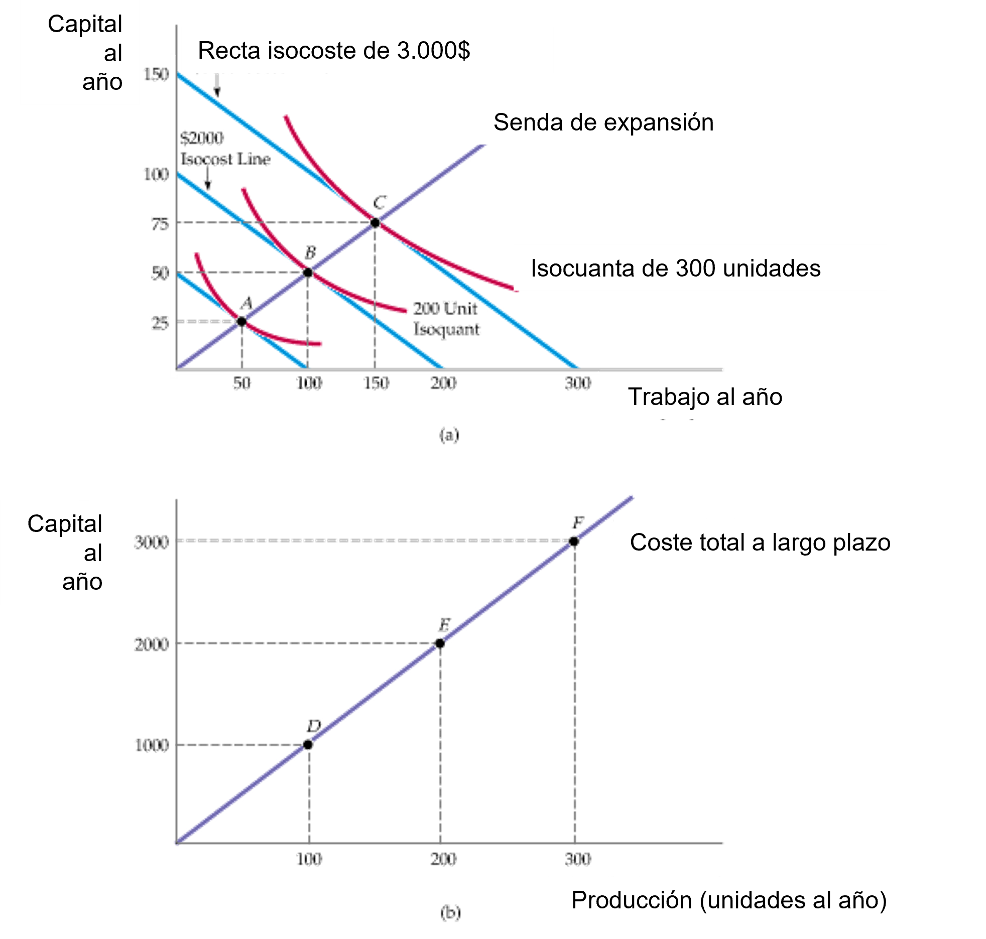 En (a) la senda de expansión que parte del origen (y que pasa por los puntos A, B y C) muestra las combinaciones de trabajo y capital de menor costo que pueden utilizarse para obtener cada nivel de producción a largo plazo, es decir, cuando es posible alterar ambos factores de producción.
