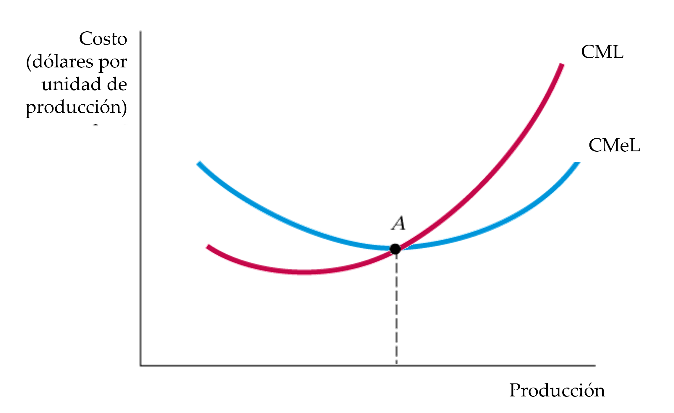 Cuando una empresa produce en un nivel de producción en el que el costo medio a largo plazo \(CMeL\) es decreciente, el costo marginal a largo plazo \(CML\) es menor que el \(CMeL\).