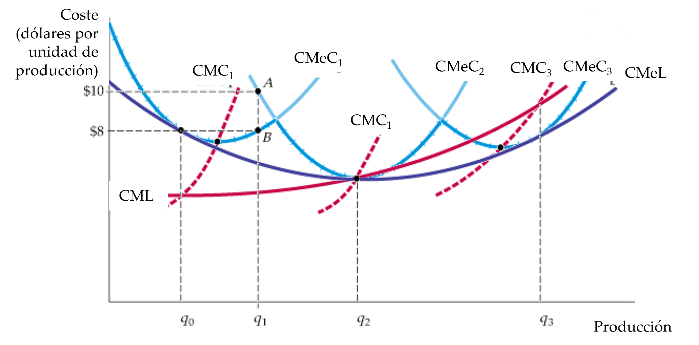 La curva de costo medio a largo plazo, CMeL es la envolvente de las curvas de costo medio a corto plazo CMeC1, CMeC2 y CMeC3