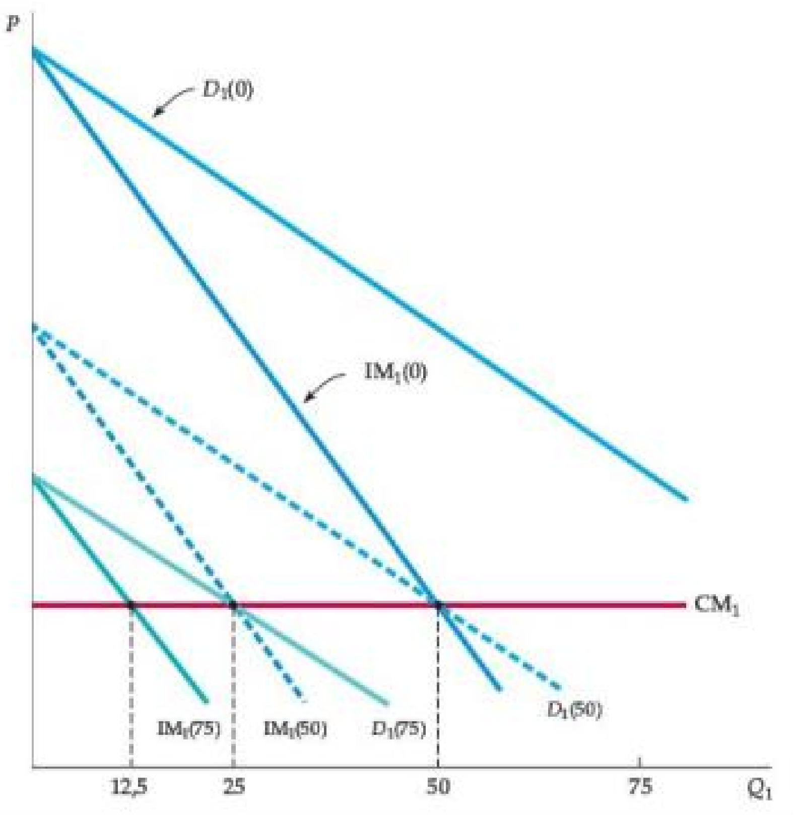 Estableciendo \(IM_1 =CM= 0\), se obtiene \(Q_1 = 15\) y \(Q_2 = 7,5\).
