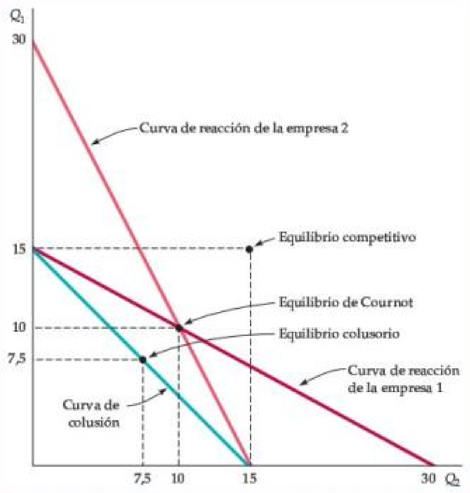 El ingreso total para la Empresa 1: \[ I_1 = P\cdot Q_1 = (30 - Q)Q_1 \] entonces \[ IM_1 = \Delta I_1 / \Delta Q_1 = 30 - 2Q_1 - Q_2 \] Curvas de reacción (igualando (IM_i=CM_i)): \[ Q_1=15-\tfrac{1}{2}Q_2, \qquad Q_2=15-\tfrac{1}{2}Q_1. \]