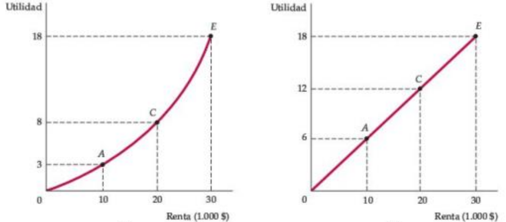 En la izquierda el consumidor es amante del riesgo: Preferiría la misma apuesta (con una utilidad esperada de 10.5) al ingreso cierto (con una utilidad de 8).