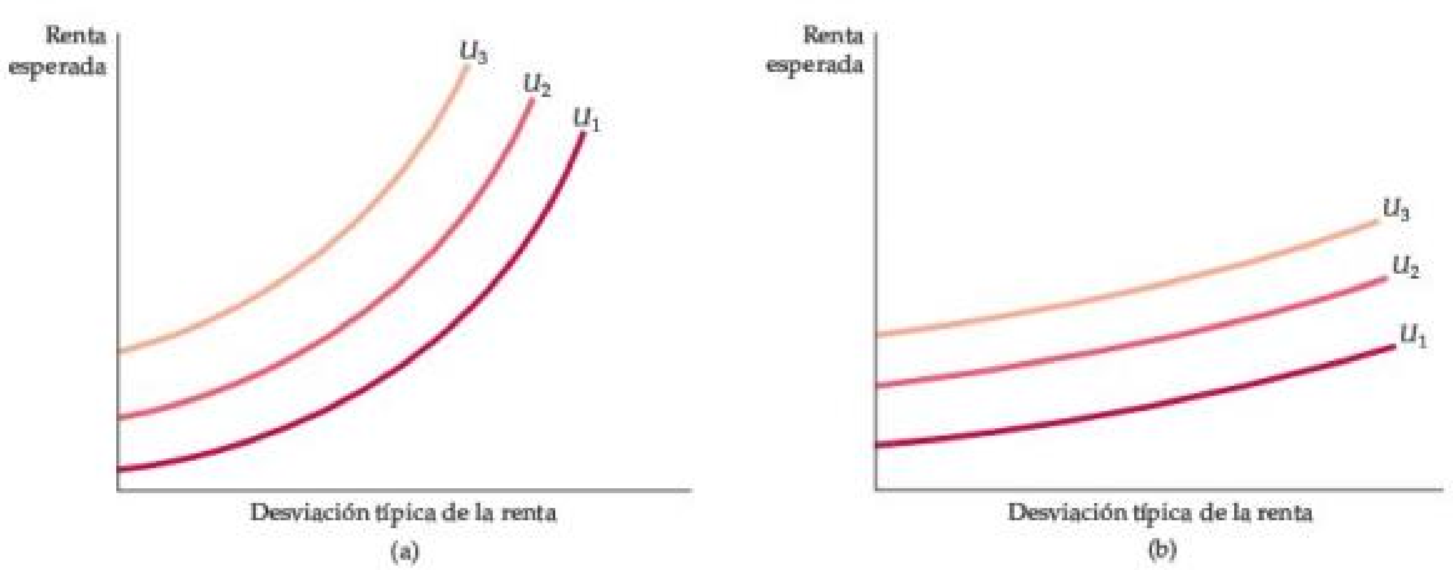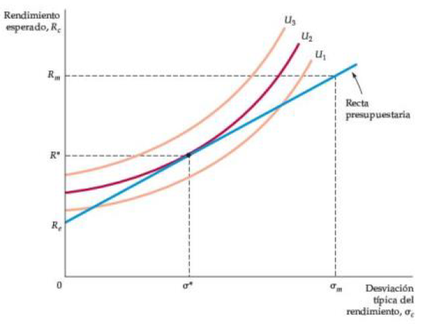 Las curvas son ascendentes porque un inversionista adverso al riesgo requerirá un mayor rendimiento esperado si debe asumir un mayor riesgo. La cartera de inversión que maximiza la utilidad está en el punto donde la curva de indiferencia \(U_2\) es tangente a la línea de presupuesto.