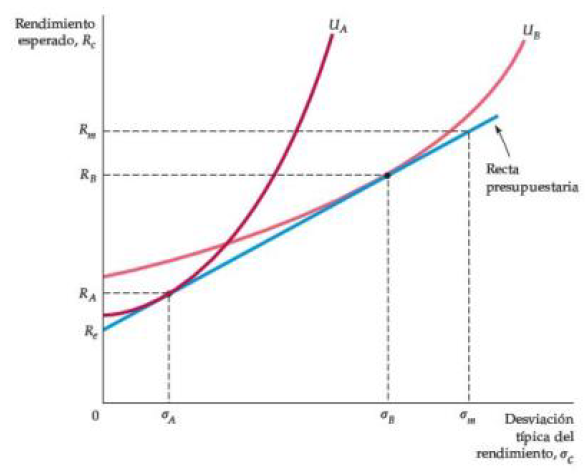 El inversionista B, sin embargo, tiene un muy bajo grado de aversión al riesgo. Su curva de indiferencia, (U_B), es tangente a la línea de presupuesto en un punto donde el rendimiento esperado y la desviación estándar de su cartera exceden los del mercado de acciones en general.