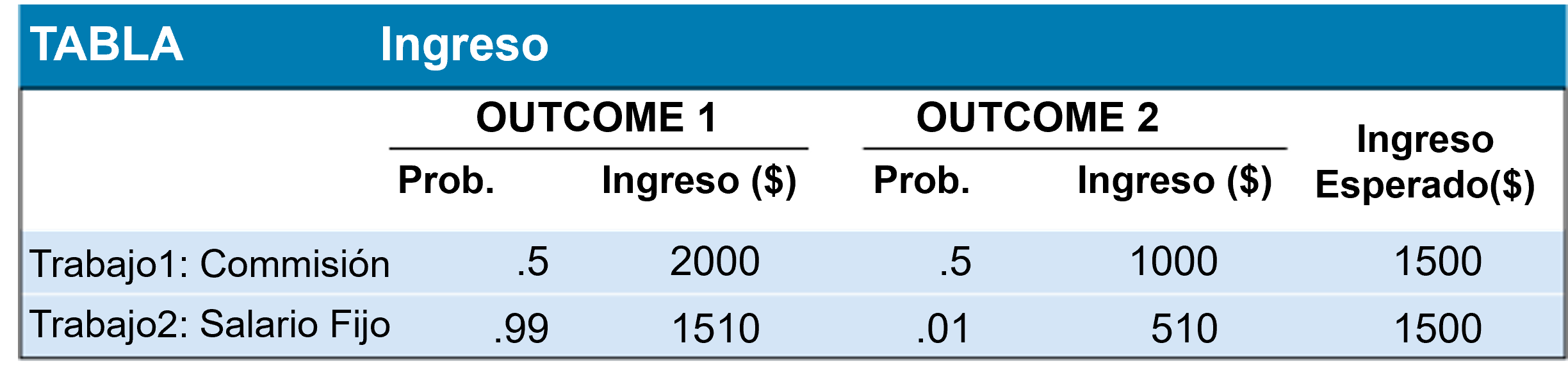 | Seguro | Robo (Pr=0,1) | Sin robo (Pr=0,9) | Ingreso esperado | Desv. estándar |