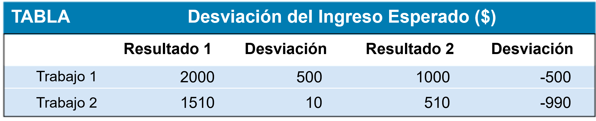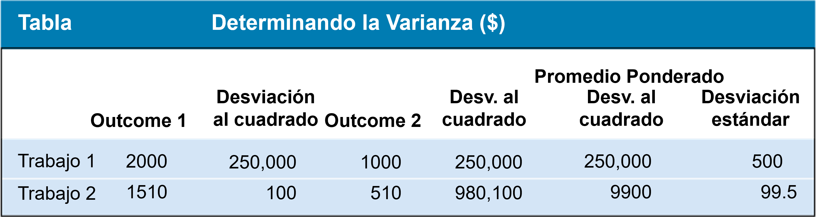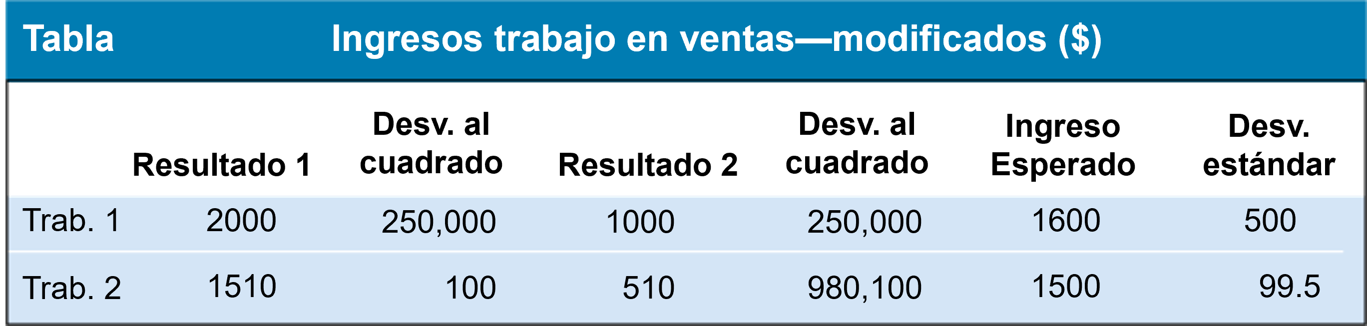 Supongamos que se aumenta el rendimiento del primer empleo en 100, por lo que los rendimientos esperados pasan a ser 1600. El cuadro muestra los nuevos ingresos y los cuadrados de las desviaciones.