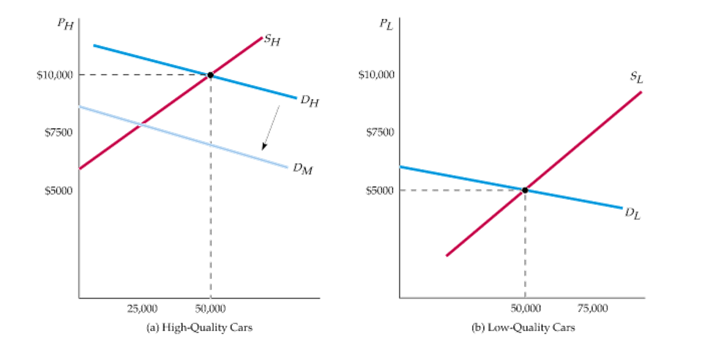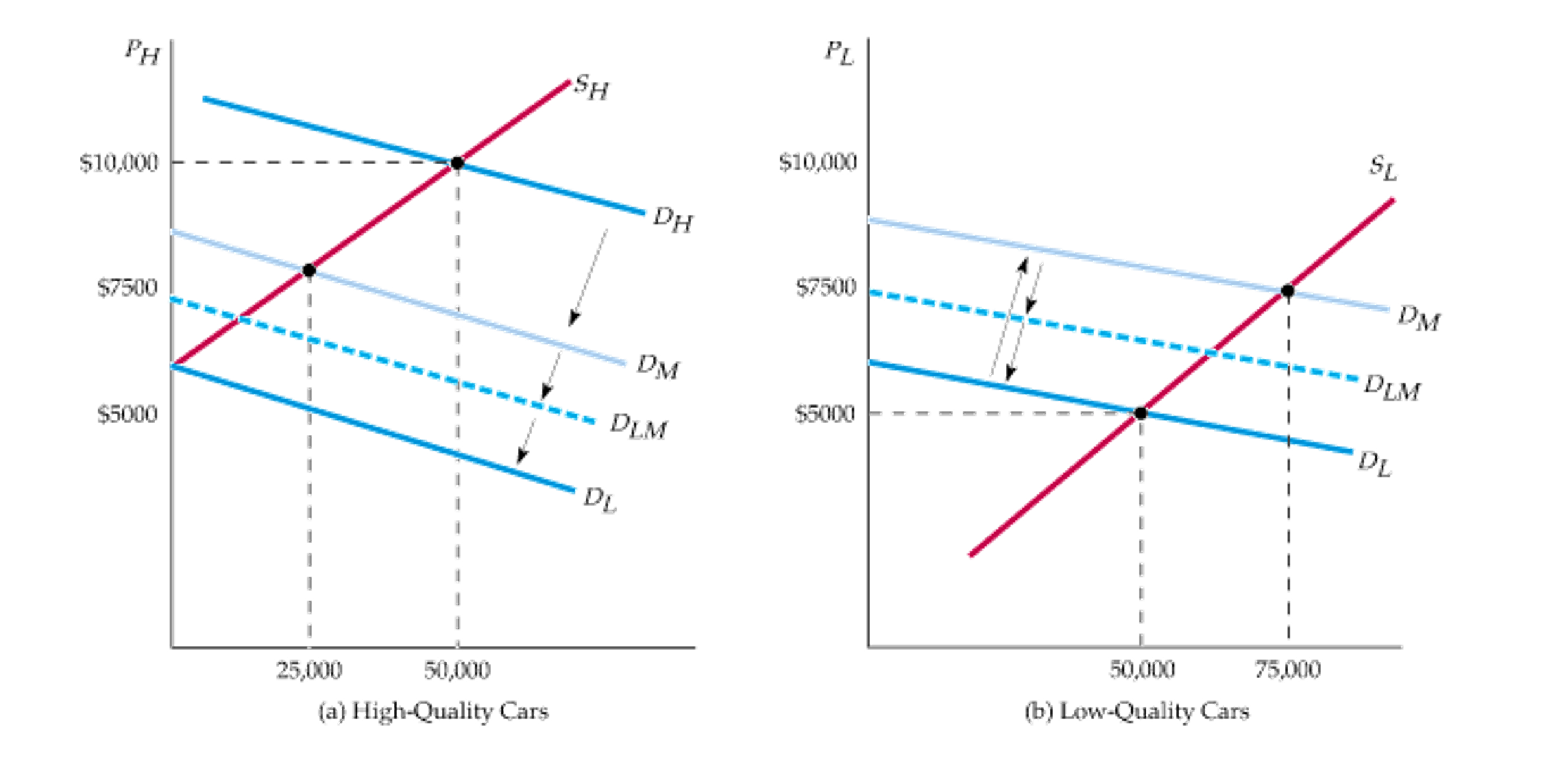 En el gráfico, a medida que los compradores bajan sus expectativas de calidad, la demanda de autos buenos se contrae (de \(D_H\) a \(D_M\)), mientras que el mercado de autos malos se expande. Eventualmente, el mercado de alta calidad puede desaparecer.