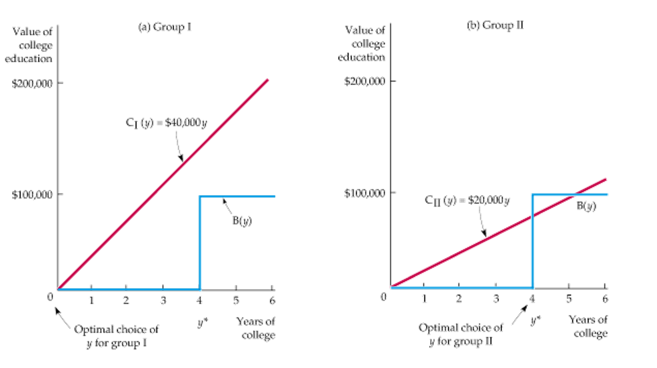 La decisión de educarse depende de si el beneficio salarial, \(B(y)\), supera el costo de la educación, \(C(y)\). Como \(C_I > C_{II}\), solo el Grupo II elige educarse.