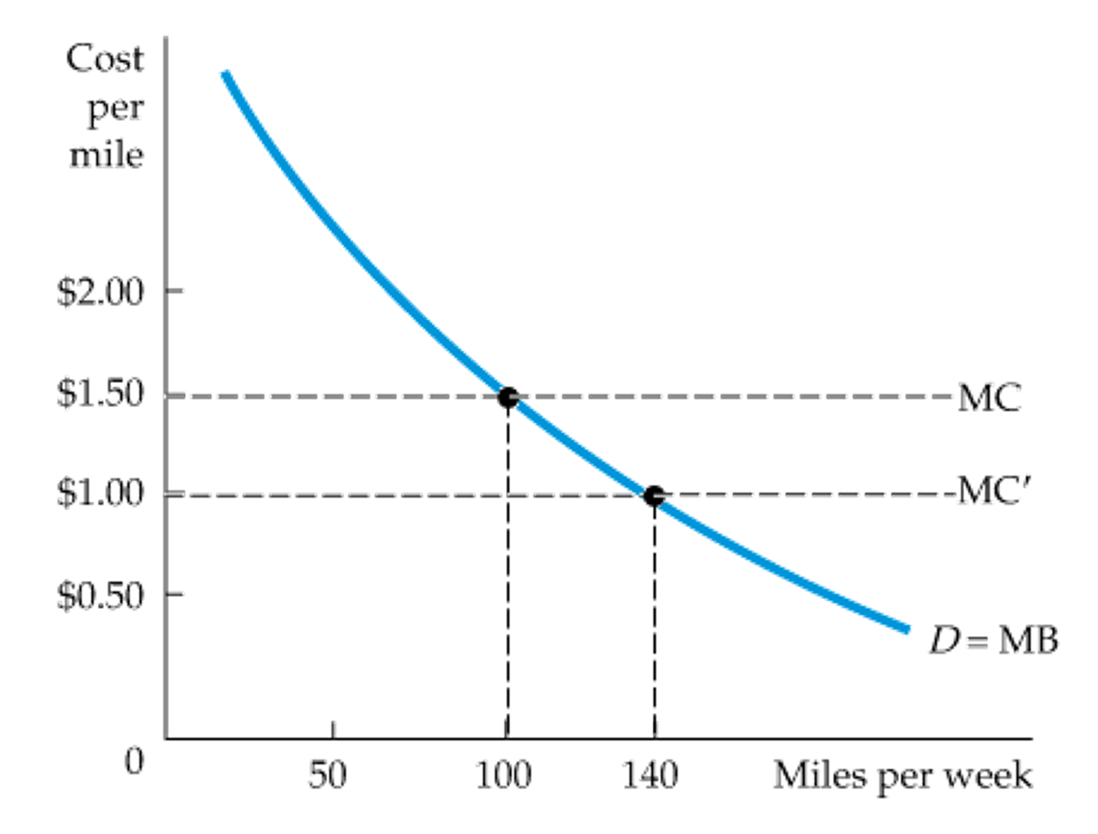 El seguro reduce el costo marginal percibido por el conductor de \(MC\) a \(MC'\), lo que lo induce a “consumir” más millas de las que son socialmente eficientes.