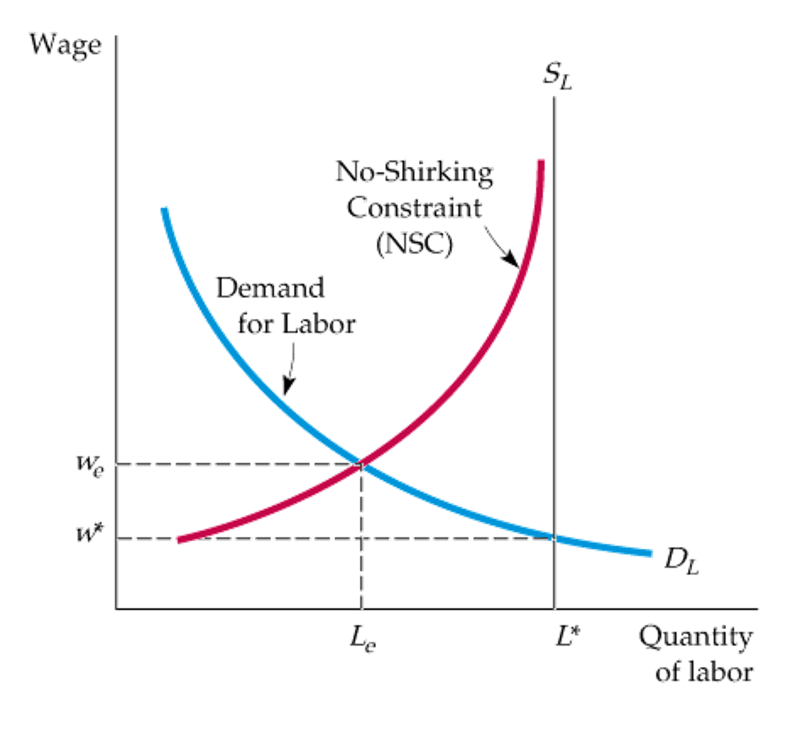 La Restricción de No-Shirking (NSC) muestra el salario mínimo que la empresa debe pagar para incentivar el esfuerzo. El equilibrio se da donde la demanda de trabajo de la empresa se cruza con esta restricción, resultando en un salario \(w_e\) y desempleo.*
